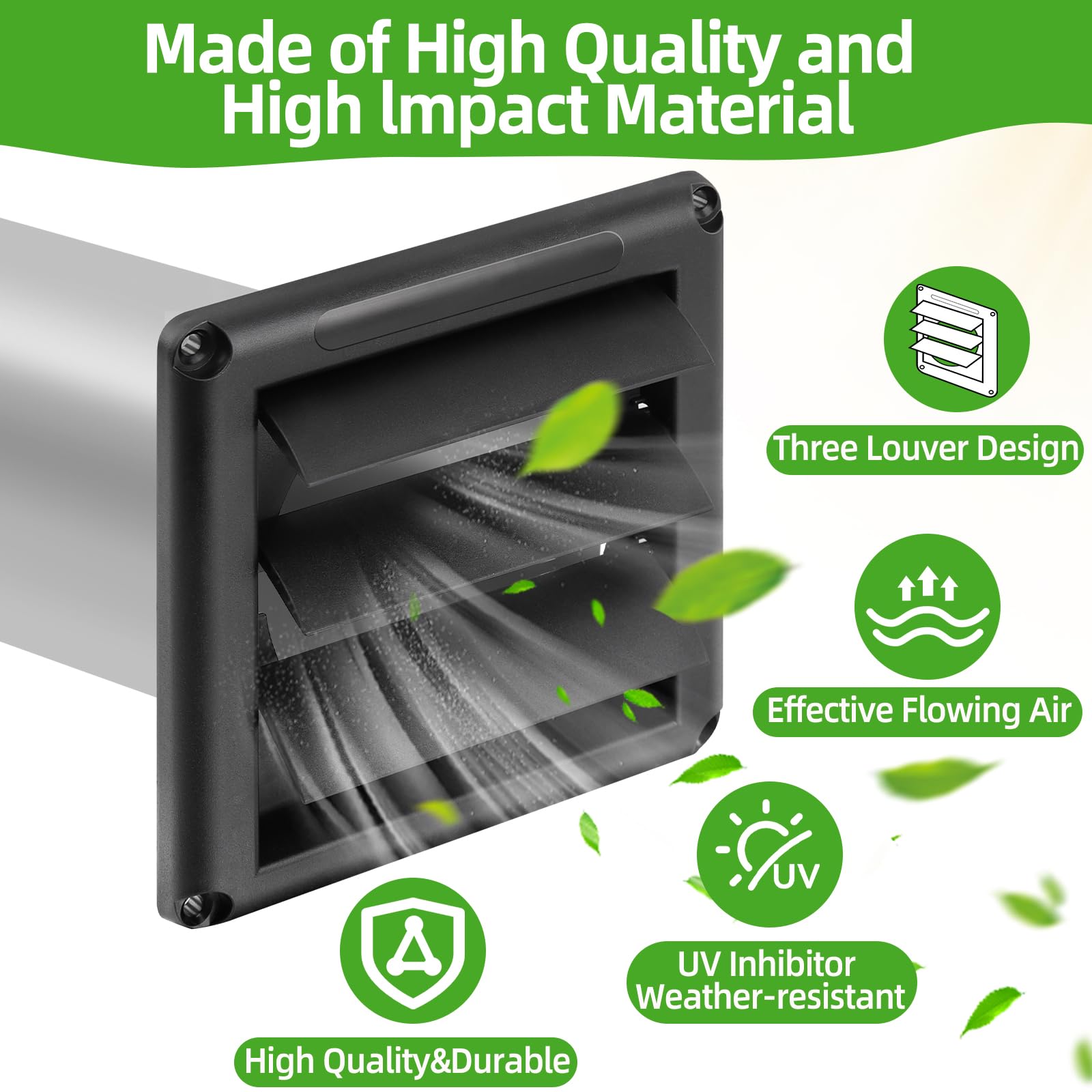 High Quality 4" dryer vent duct hose connector : Our dryer wall vent kit for exhaust fan is made of high quality and high impact material, and add UV inhibitor in the hood, durable and weather-resistant, prevent the vent cover cracking or warping when facing the sun.