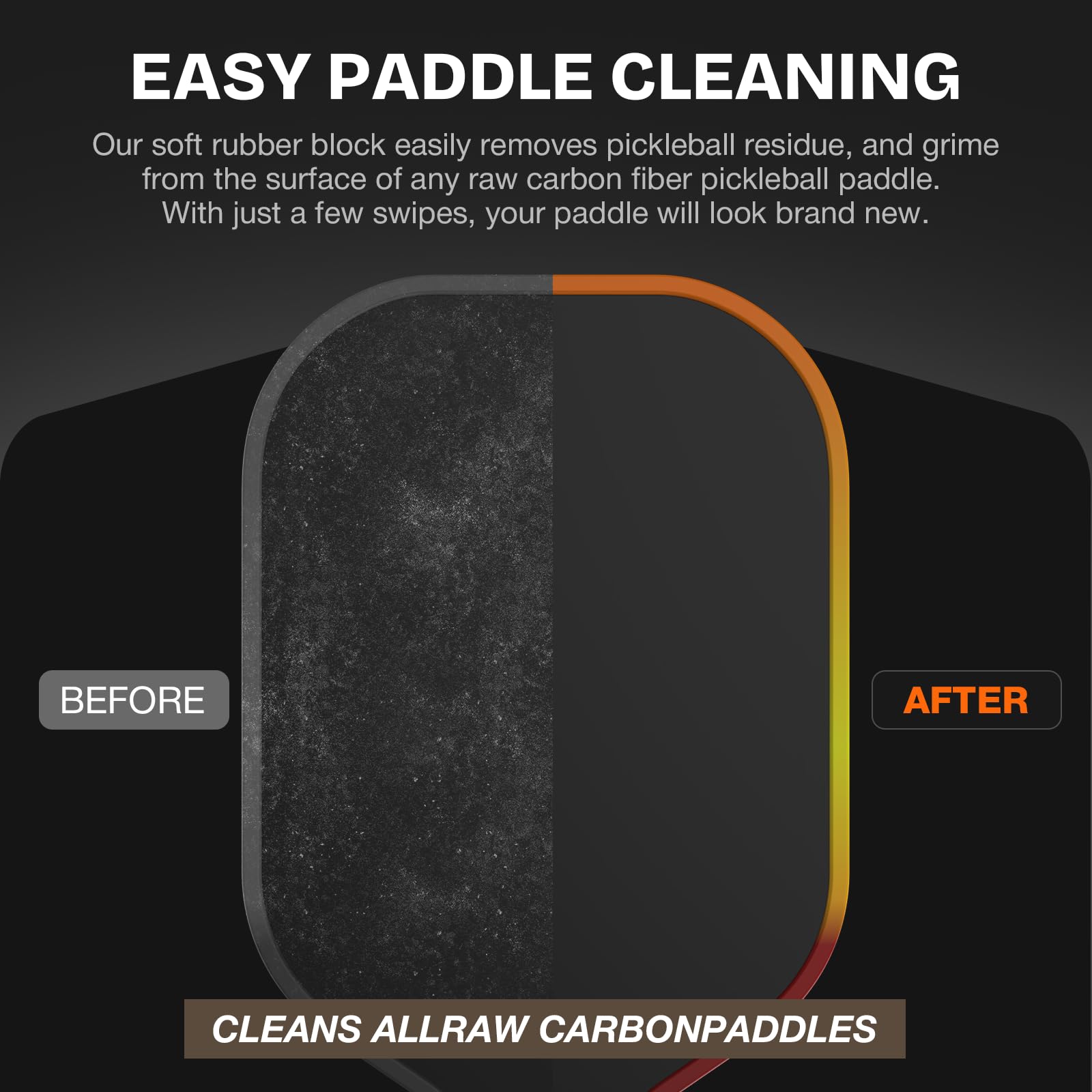 EASY PADDLE CLEANING: Our soft rubber block easily removes pickleball residue, and grime from the surface of any raw carbon fiber pickleball paddle. With just a few swipes, your paddle will look brand new.