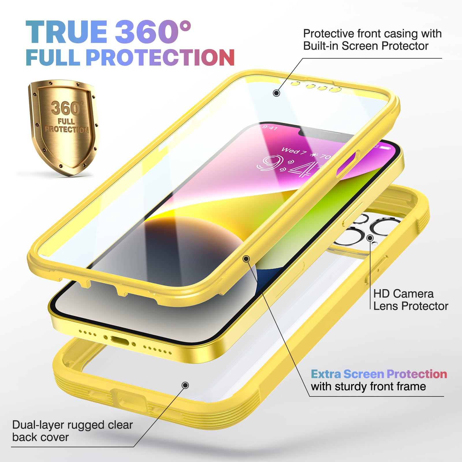 【360 Degree Full Body Rugged Protection】 Dual layer provides 360 degree full body rugged protection. Soft TPU shock absorption and raised 4 corners surround your phone and protect it from accidental drops and falls. Provide tempered glass camera lens protector that can protect the camera 100% and will not affect the quality of the photo.
