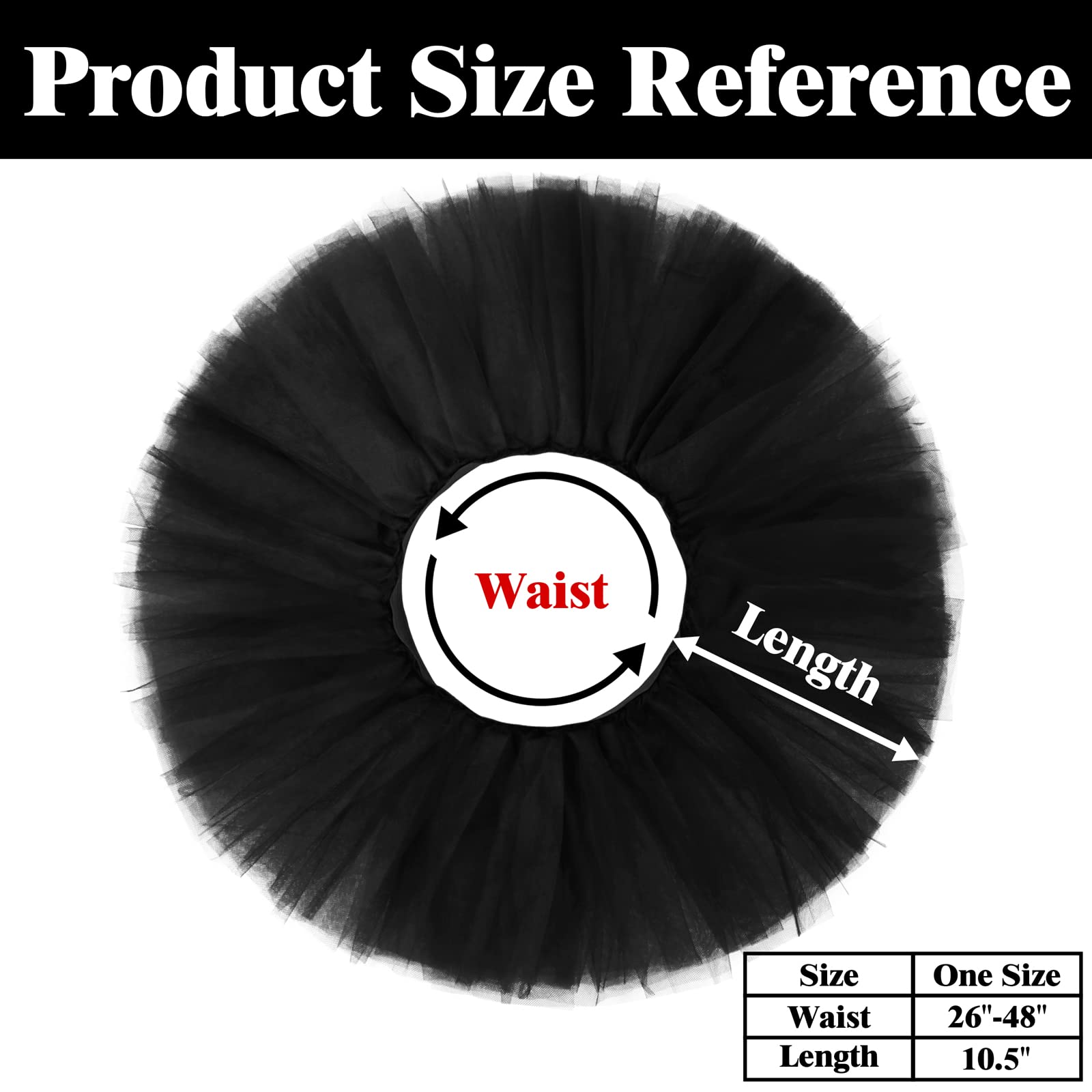 SIZE INFORMATION: One Size fits for most. The adult tutu skirts for women measure about 10 inches in length. And our tutus are designed with comfortable and stretchy waistband, which can be adjusted approximately from 26" to 48" in width. The waist circumference of the tutu is 26'' when not stretched; and due to excellent elasticity of the waistband, the maximum waist circumference can reach 48'' when stretched. The tutu for women is not only durable, but also very easy to slip-on or off.