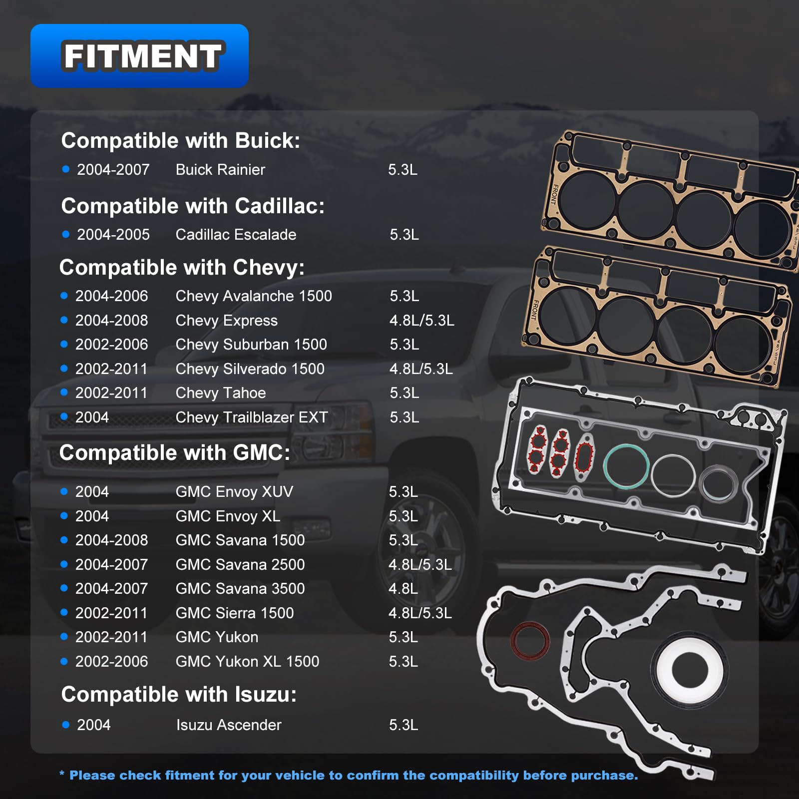 FITMENT1: Full head gasket compatible with Chevy: 2002-2004 Avalanche 1500 5.3L | 2002-2004 Suburban 1500 5.3L | 2002-2004 Silverado 1500 4.8L 5.3L | 2002-2011 Tahoe 4.8L 5.3L | 2003-2004 Trailblazer EXT 5.3L | 2003-2004 Express 1500 5.3L | 2003-2004 Express 2500 4.8L 5.3L | 2003-2004 Express 3500 4.8L. Compatible with 2004 Buick Rainier 5.3L