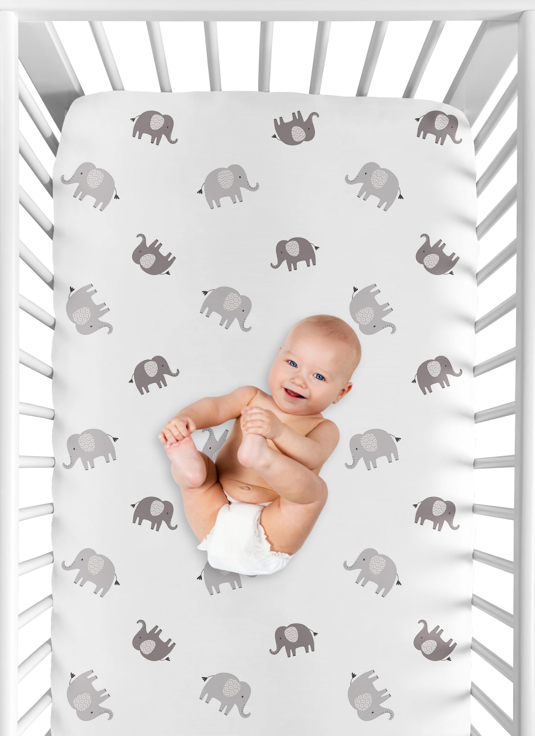 This brushed microfiber crib sheet features an exclusive design of grey and white modern boho bohemian jungle safari silver gray animal elephants print.