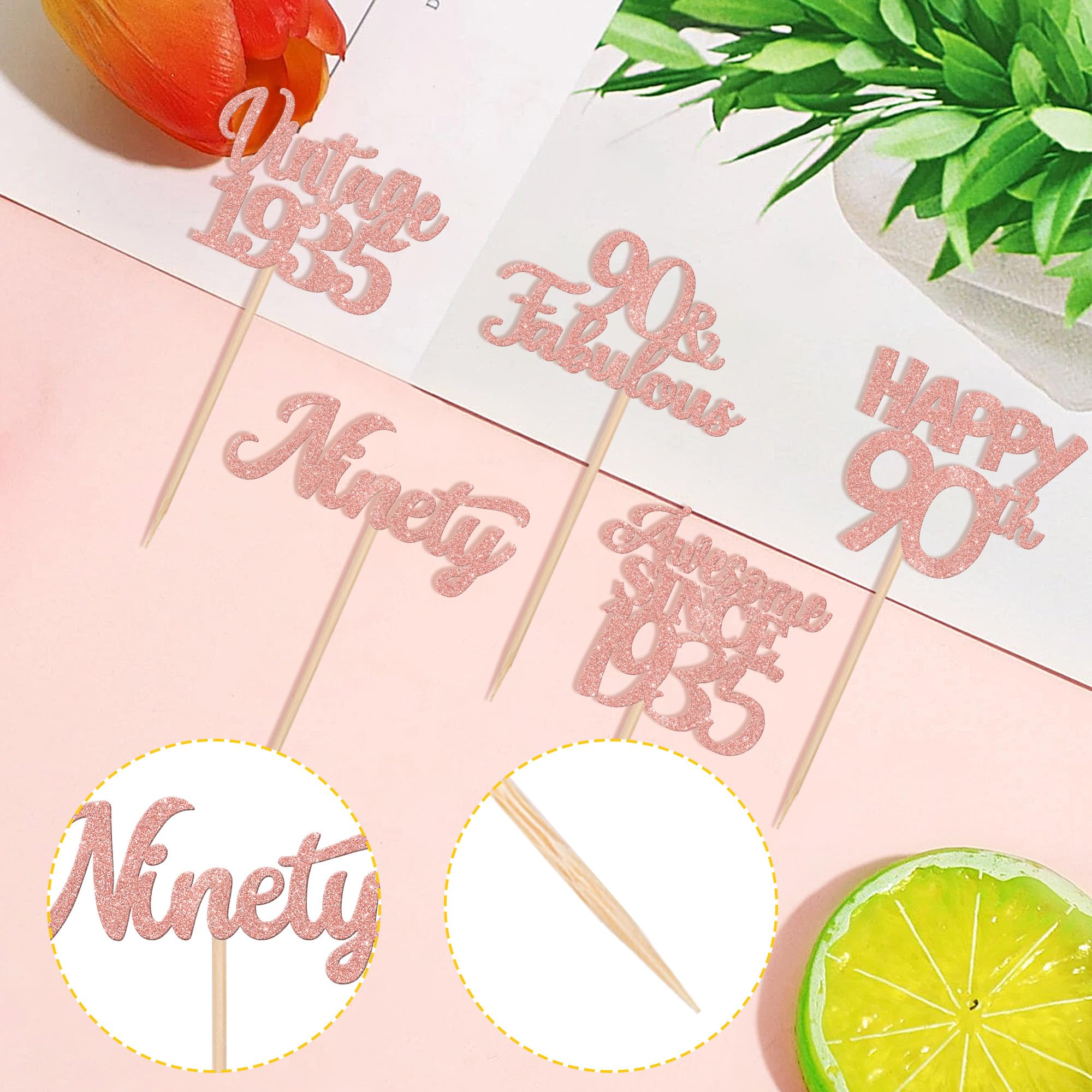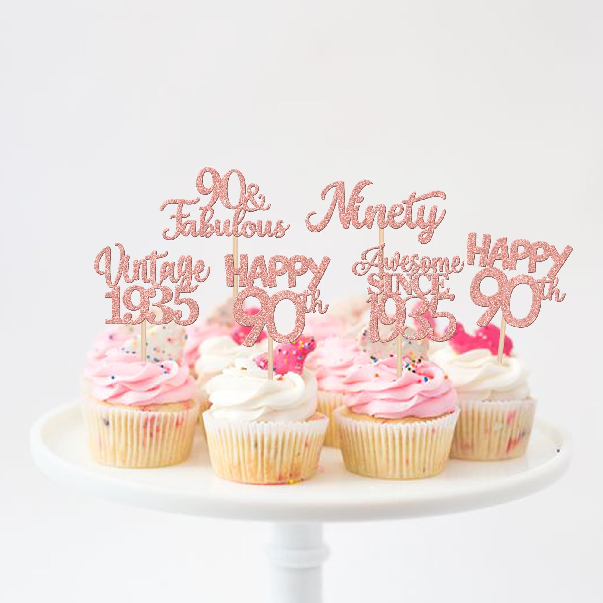 Vintage 1935 Happy 90th Birthday Party Cupcake Toppers Decoration Supplies Perfect for vintage 1935 theme party, 90th birthday theme party, 90th wedding anniversary theme party,cheers to 90 years theme party cupcake decorations supplies. Pack of 30 pcs,6 pcs of each design The size is 2.2*4.3/ 2.5*4.3/ 2*4.3/ 2.2*4.5/ 2.7*3.9 inch ( with stick ) Made of high quality paper card stock,thick and thick and sturdy. These cupcake toppers are single glitter, the back is white, and they are intended for decoration only, please do not put them in oven or microwave. If the item you received has any defects, please contact us immediately.we will deal with it within 24 hours.