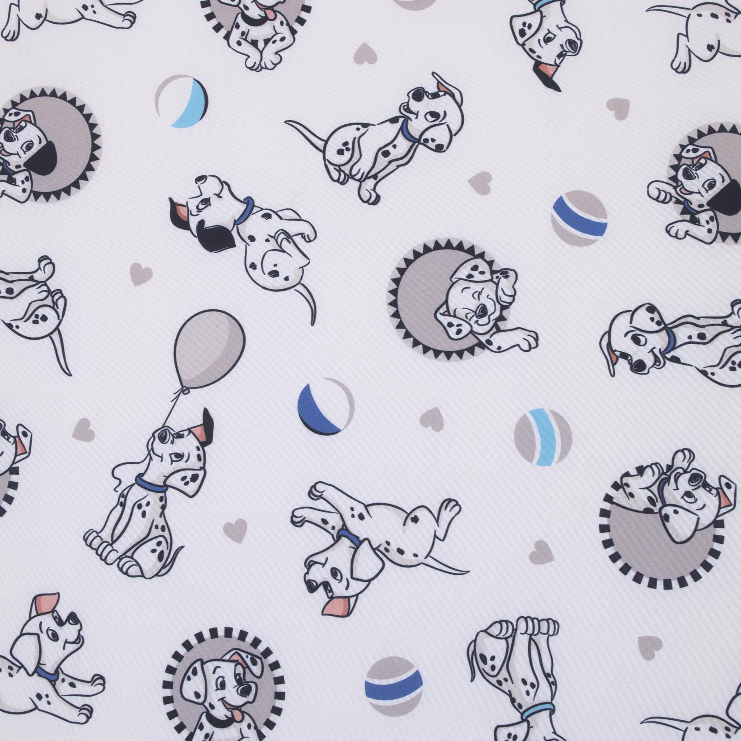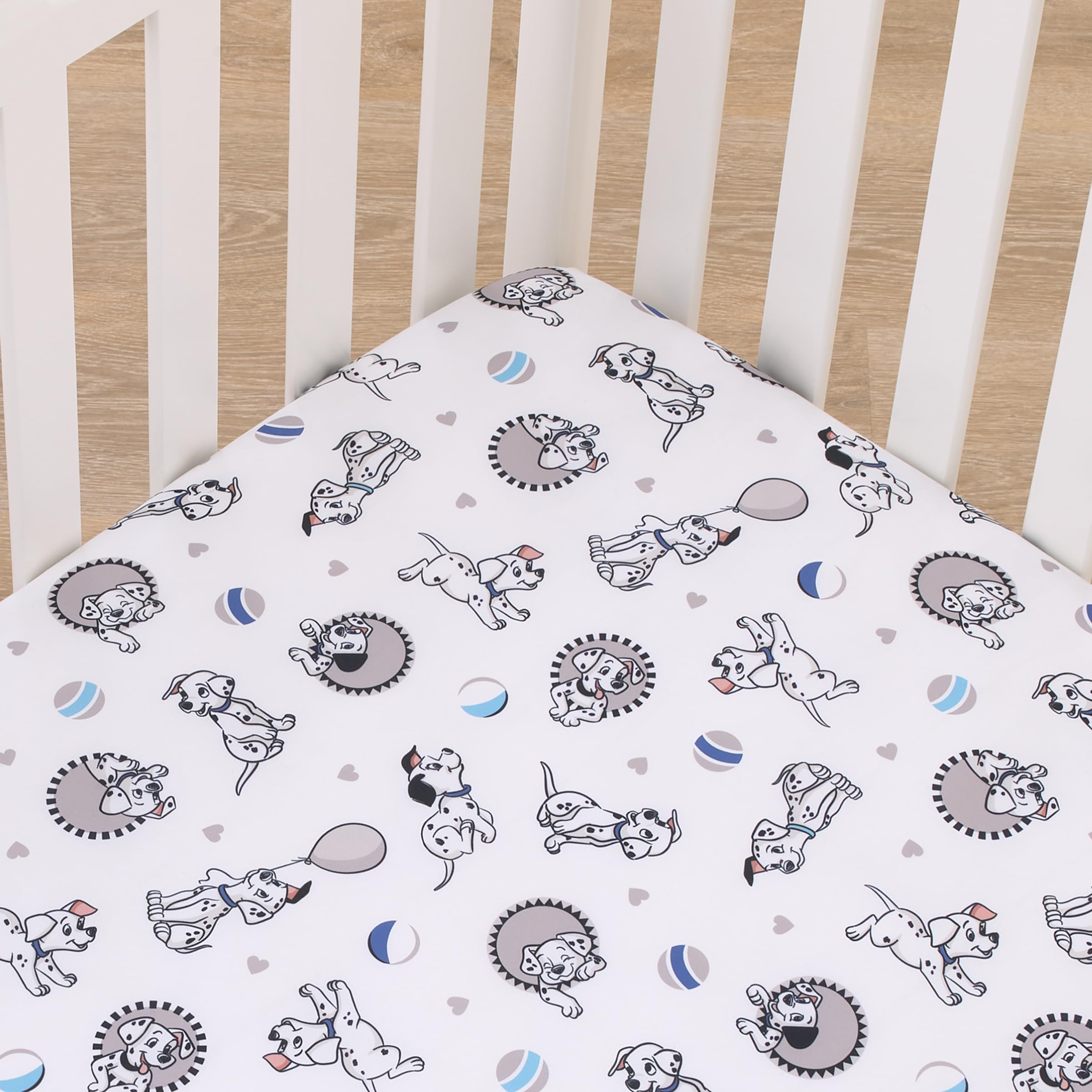 The Disney 101 Dalmatians Fitted Crib Sheet features an adorable allover pattern of playful puppies. Designed in shades of black and white spots, with accents in gray and blue, assorted puppies with balloons, balls, and hearts! Your little one will sleep soundly on this crib sheet's cozy surface. Measures 28" x 52" x 8" and includes full elastic edges for a safe and snug fit and fits a standard size crib/toddler mattress. Coordinates nicely with most decor and perfect for your 101 Dalmatians nursery!