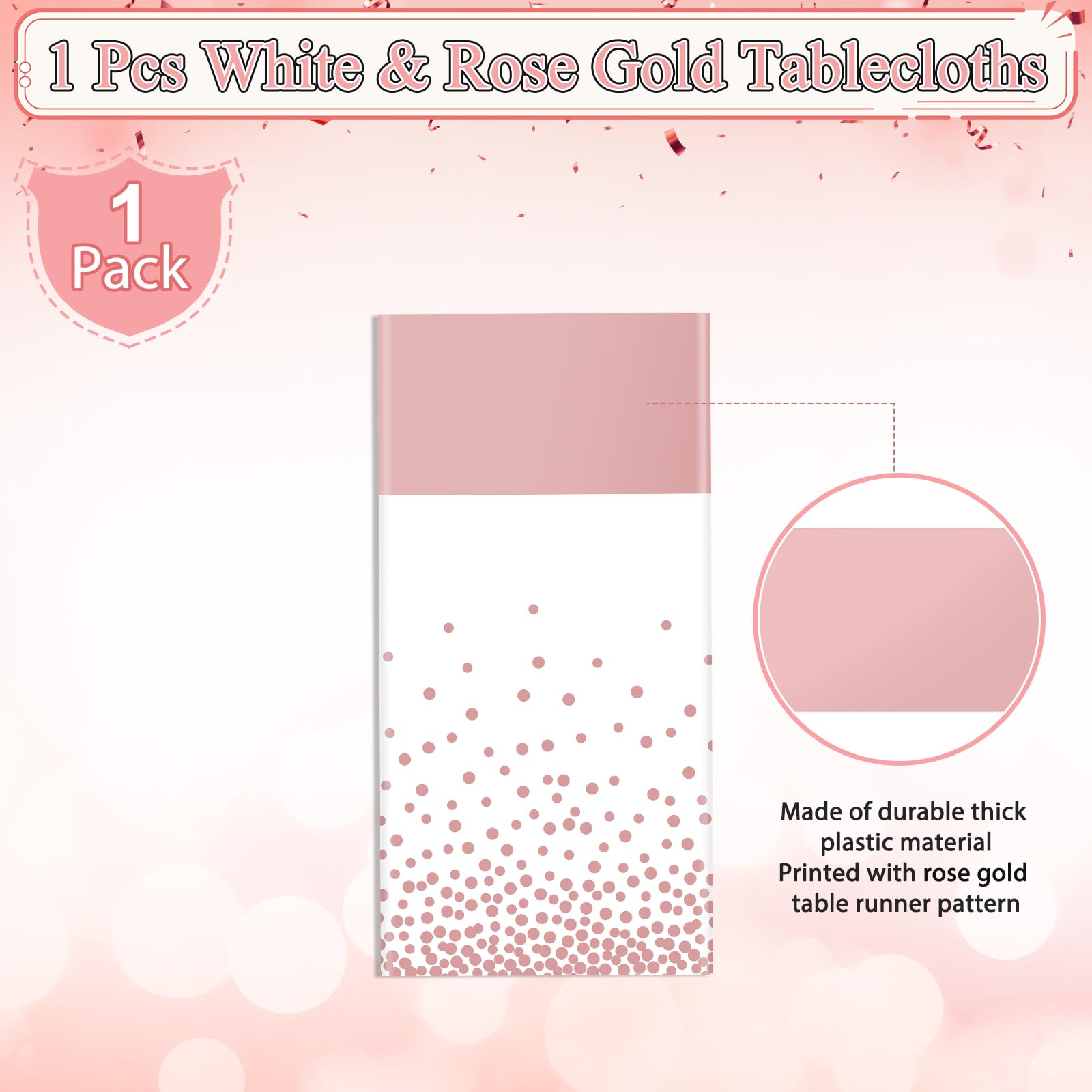 What will you receive: 1 pieces plastic white and rose gold party tablecloth,all over printed with rose gold dot on white background,the rose gold table runner in the middle is printed pattern,ideal for decorating your graduation birthday party supplies and decorations
