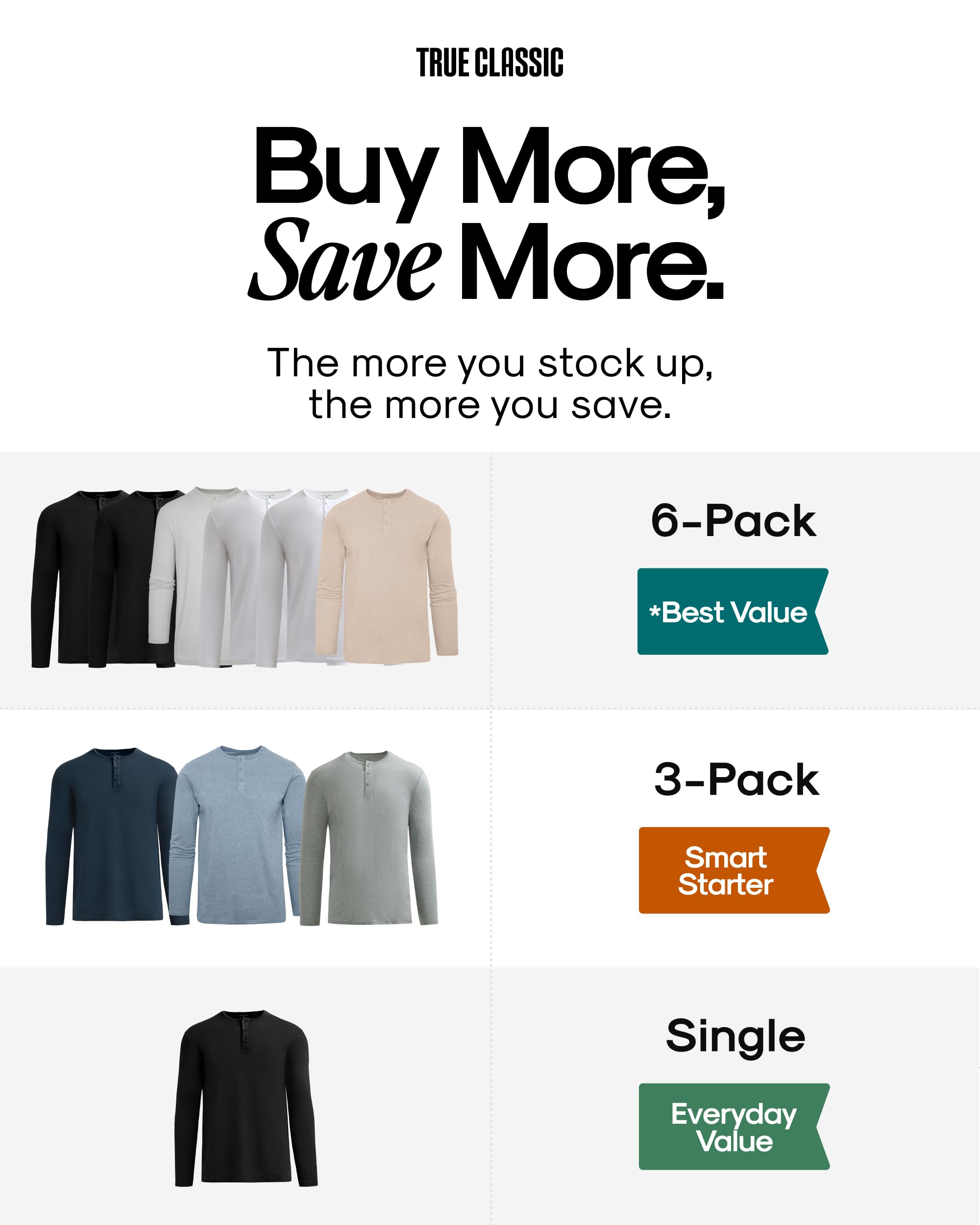 Description Meet the long sleeve men shirts lineup that fits perfect. The True Classic collection pairs a modern, athletic silhouette with soft, breathable fabrics that move easily and hold their shape. Our premium long sleeve crew and long sleeve Henley are crafted from a smooth 60/40 cotton-poly blend that layers effortlessly and stays comfortable all day. When the weather cools, reach for the waffle long sleeve crew—its brushed modal-cotton knit delivers extra warmth with the same easy stretch. Tag-free labels keep things itch-free, classic side seams maintain structure, and minimal shrinkage helps ensure that true-to-size fit wash after wash. Available in S–3XL and a range of versatile colors including the black long sleeve t shirt men love and the white long sleeve t shirt men need, each style is built for everyday wear—office, off-hours, and everything in between. Wash cold, dry low (up to 5% shrinkage), and you’re set. Slip on your favorite True Classic long sleeve and head out feeling comfortable, put-together, and ready for the day.