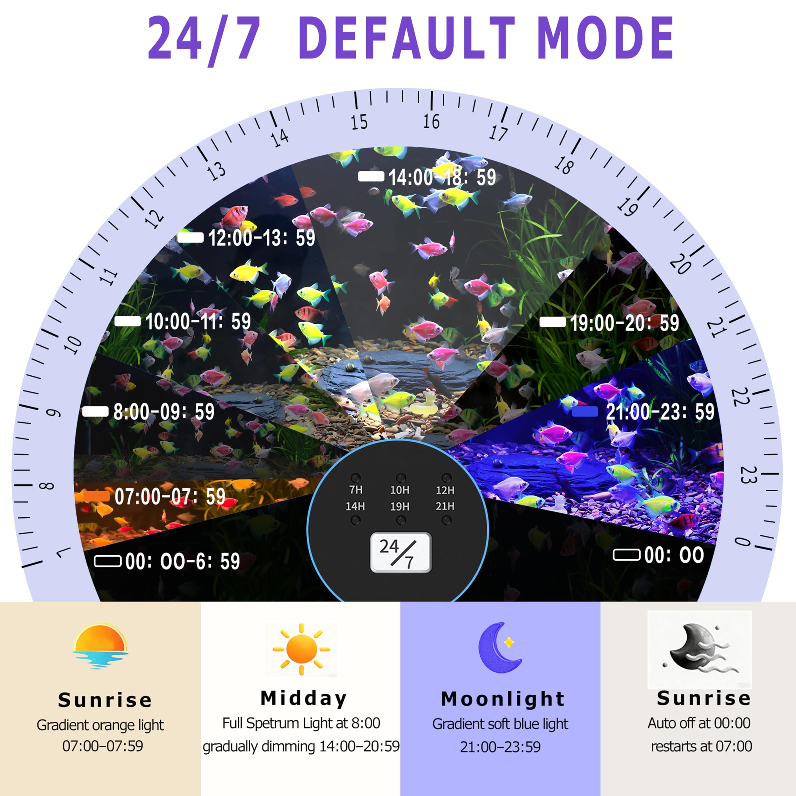 🐟24/7 DEFAULT MODE: Simulates sunrise, daylight, sunset, and night in a seamless, around-the-clock cycle that runs continuously—24 hours a day, 7 days a week. Start the cycle at any time to create a natural, stable, and stress-free environment for fish.