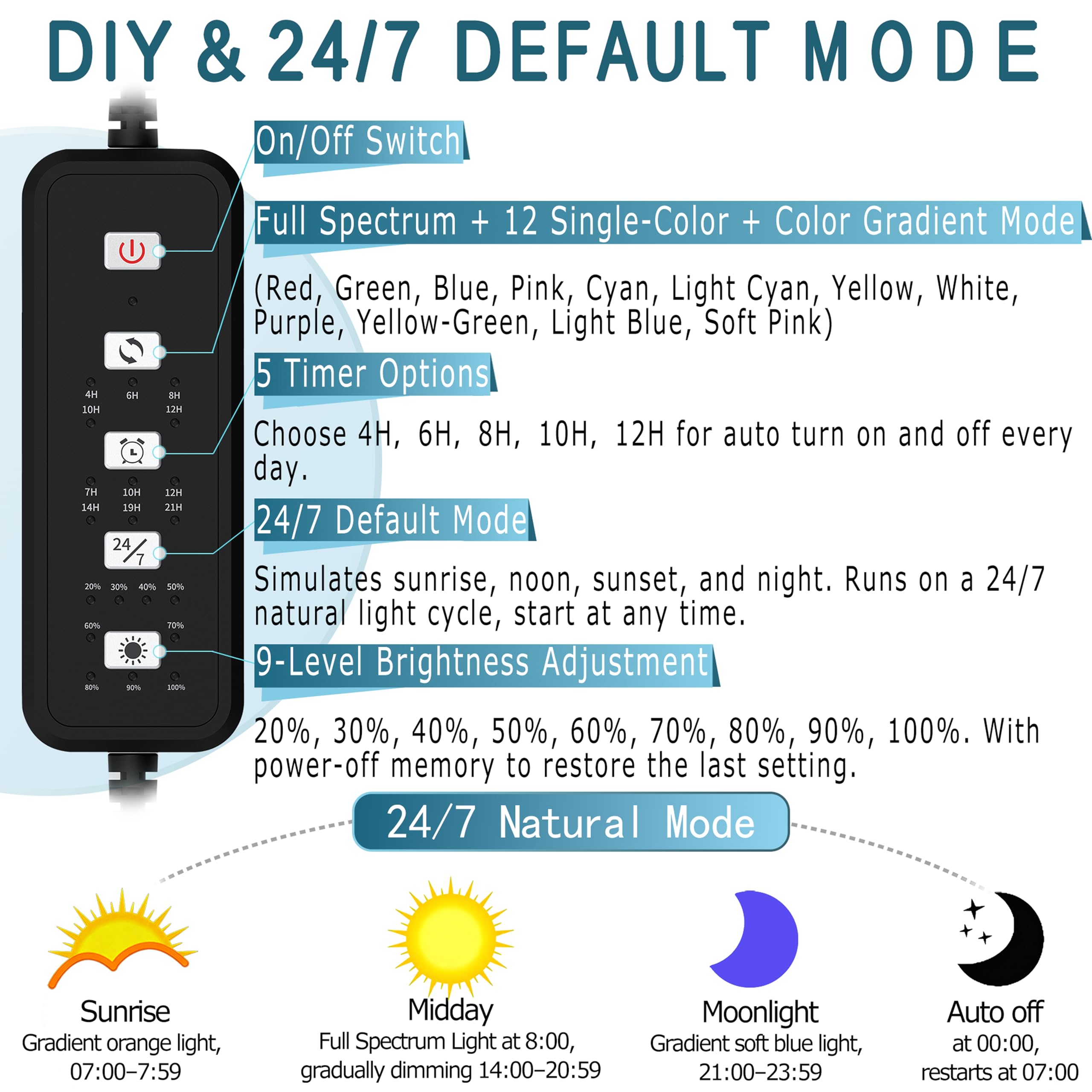 🐟5 SMART TIMER WITH AUTO ON/OFF: Choose from 5 timer settings (4H/6H/8H/10H/12H) to run daily cycles automatically, so you never worry about forgetting to turn the light on or off.