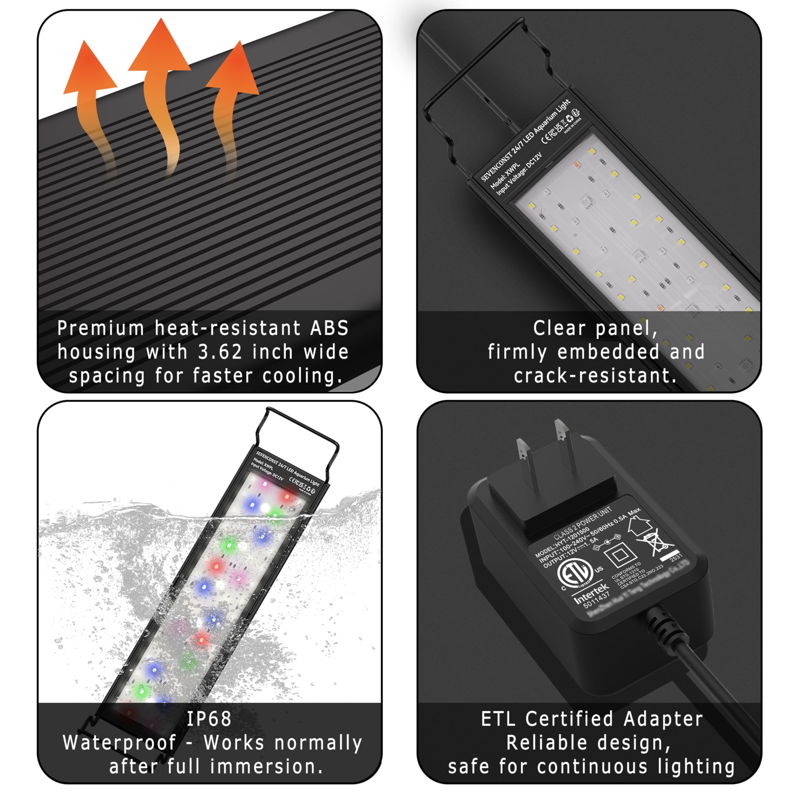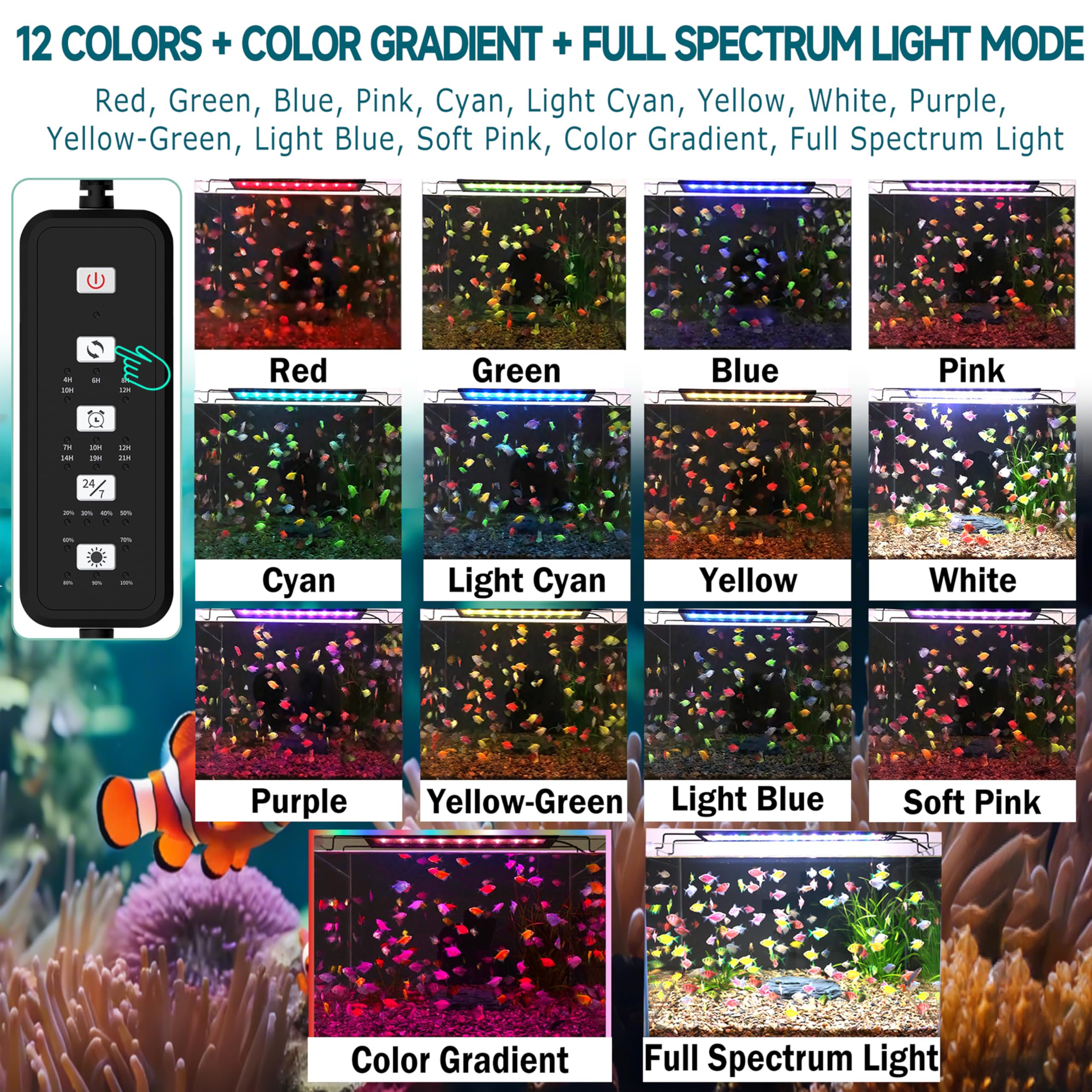 🐟FULL SPECTRUM WITH 12 COLOR OPTIONS & GRADIENT MODE: Equipped with premium 5050 & 2835 LEDs, this aquarium light delivers a true full spectrum to support healthy plant growth and vivid fish colors. Features full-spectrum light, 12 color switches, and smooth gradient mode to create stunning underwater effects.