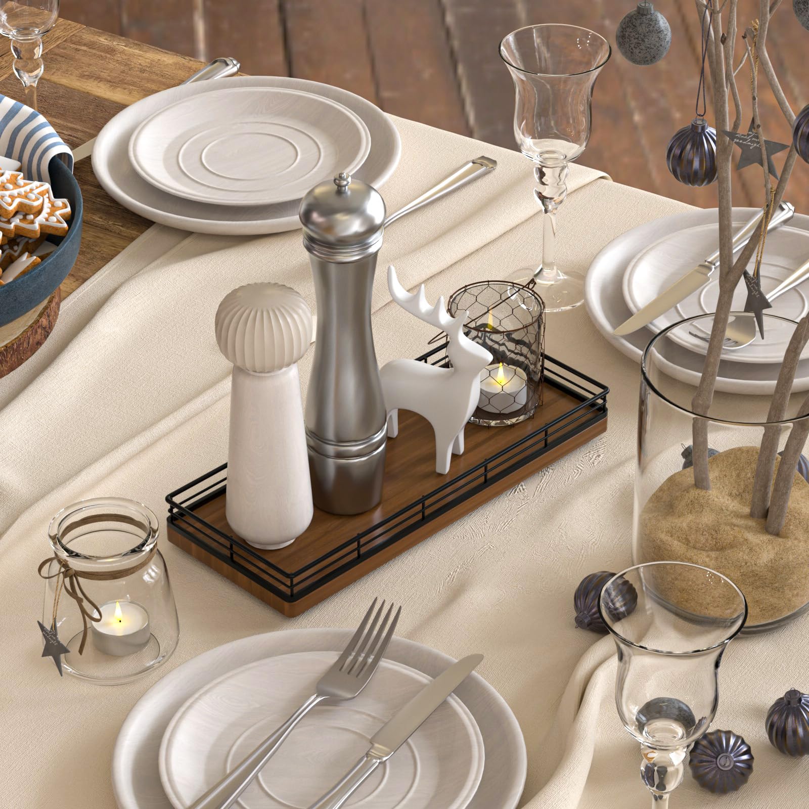 Unique Charm: Elevate your space with a unique appearance featuring a combination of iron mesh edges and solid oak base; Oak's distinctive and captivating grain pattern adds natural beauty, giving an exquisite touch of elegance and sophistication; This fusion blends modern minimalism with rustic charm seamlessly; This wood tray is crafted from high-quality oak, which ensures durability and increased load-bearing capacity