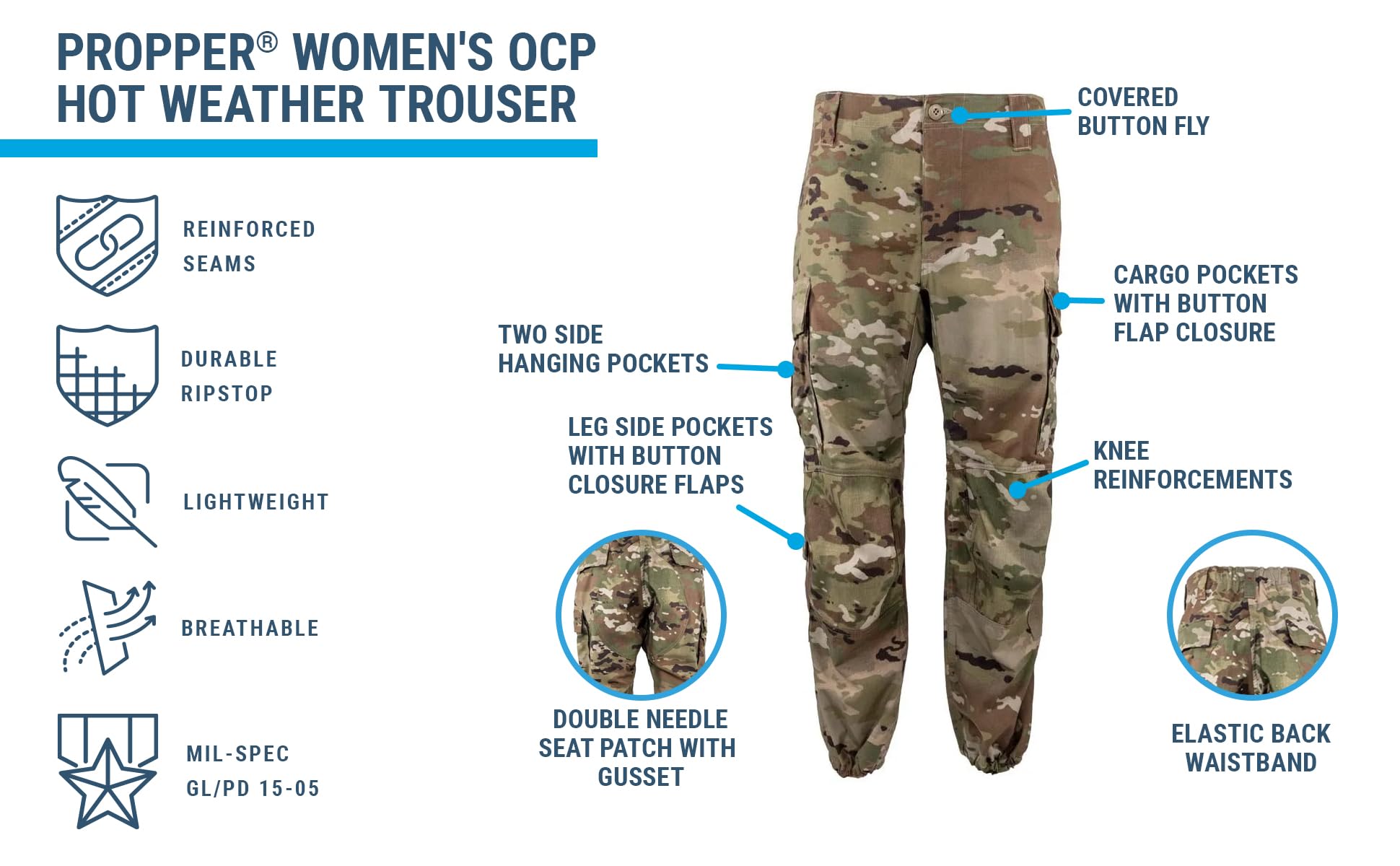 Description The Propper IHWCU (Improved Hot Weather Combat Uniform) Trouser is a lightweight, breathable, quick-drying alternative to the standard issue ACU used by the U.S. Army. Extra reinforcement in stress areas and seams are engineered to make these hot weather uniforms just as tough as standard ACUs, while the state-of-the-art nylon/cotton ripstop fabric is designed to go from drenched to dry within 60 minutes. Sewn to military specification GL/PD 15-05E.