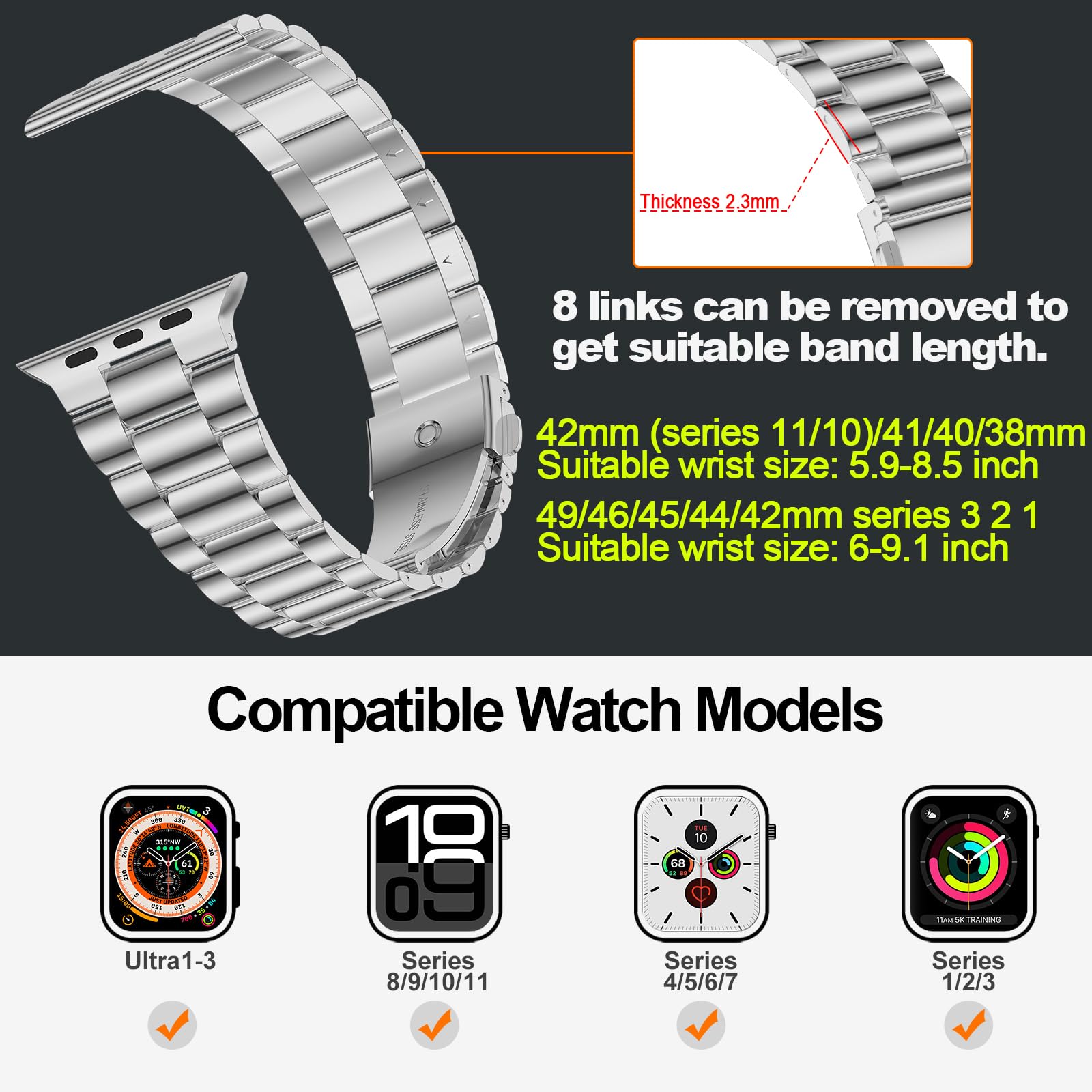 Compatible with Multiple Sizes: This premium stainless steel band fits Apple Watch 46mm series 11/10, 49mm Ultra 3/Ultra 2/Ultra, 45mm Series 9/8/7, 44mm SE3/SE2/SE Series 6/5/4, and 42mm Series 3/2/1, covering all editions.