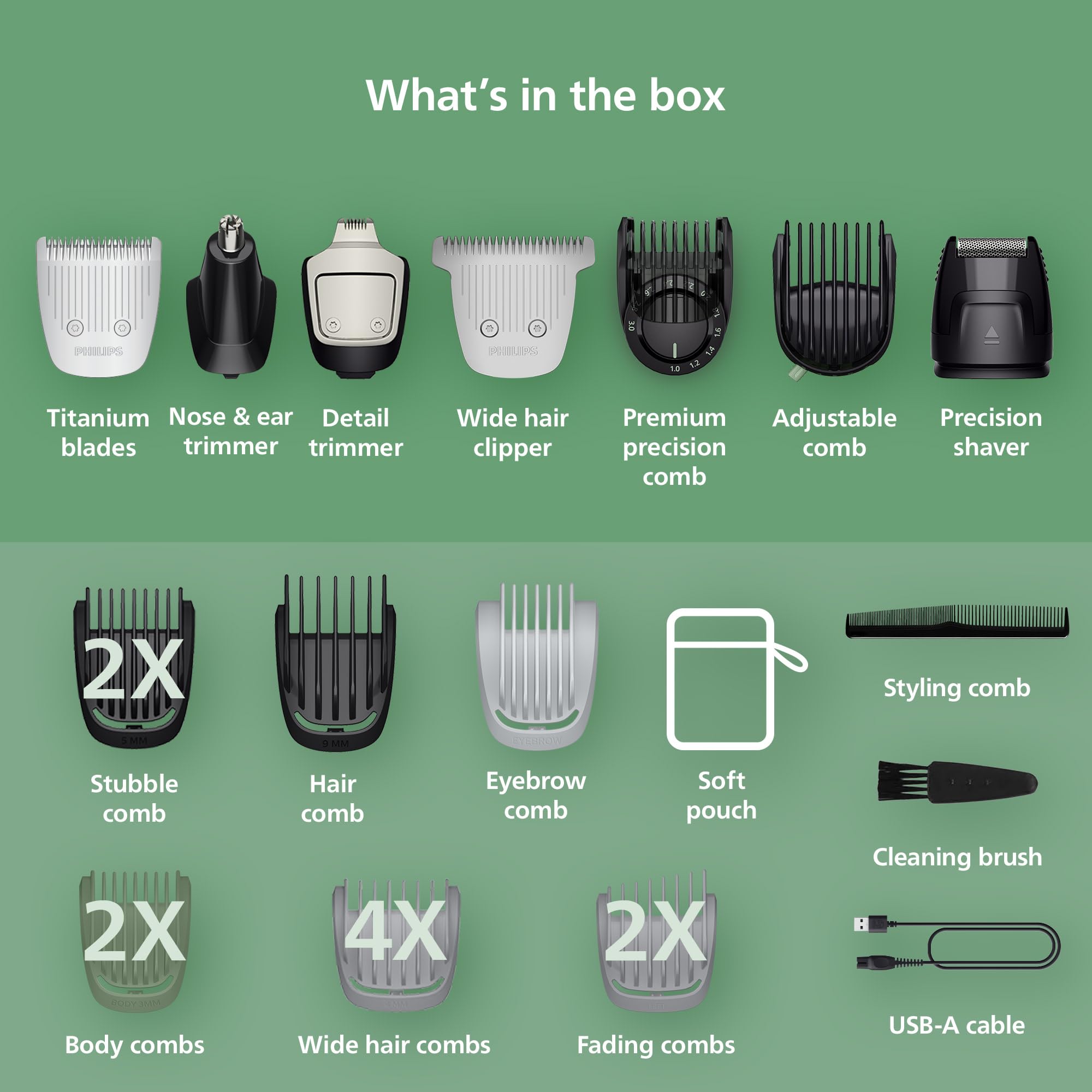 THE SET INCLUDES: 1x Philips Norelco All-in-One Trimmer 7000 Series, 1x titanium blade, 1x wide hair clipper, 1x premium precision trimming comb (1-3 mm) and more; see the "what's in the box" section