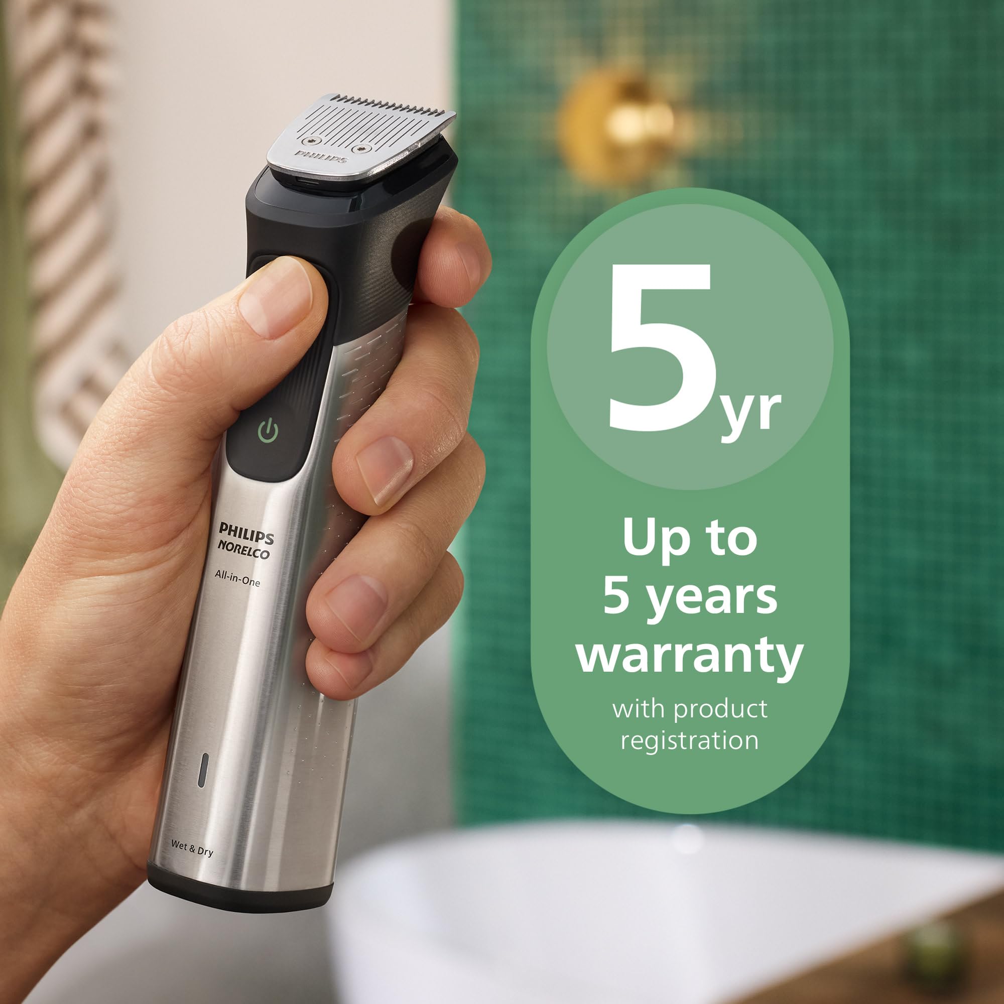 Try out a new look any day of the week with the durable Philips Norelco All-in-One 7000 Series hair trimmer for men. With 23 attachments, self-sharpening titanium-coated steel blades for long-lasting precision, and a durable 5-hour lithium-ion battery, this versatile and efficient electric razor for men efficiently tackles all your grooming needs. It's a hair and beard trimmer men can always rely on! Effortlessly trim and style your beard and hair with precision blades and beard combs that deliver clean, straight lines for your desired look. Use the hair-clipping comb with various length settings to maintain your hairstyle at home. With the click-on body comb ensuring a gentle, effective trim, the device also works perfectly as a body trimmer for men. Plus, you can easily remove unwanted nose and ear hair without nicks or cuts with the nose hair trimmer attachment. Achieve a precise and even trim with self-sharpening titanium blades that deliver added strength for maximum precision, staying as sharp as day one with no blade oil required. Select from 0.5 to 16 mm length settings to craft your desired look to the exact length you want. The premium stainless steel trimmer is easy to hold and maneuver with an ergonomic rubber grip for superior comfort and control. Built to last, the durable lithium-ion battery offers up to 5 hours of runtime for uninterrupted trimming. The battery indicator keeps you fully informed of your battery status, whether it’s low, empty, fully charged, or still charging, ensuring you're always ready for your next grooming session. With USB-A charging, it's easy to power up anywhere (adapter is not included). The 5-minute quick charge option provides enough power for one trimming session. The trimmer is 100% showerproof, so you can use it both wet and dry for a comfortable, convenient experience, every time. Plus, it’s easy to clean too.