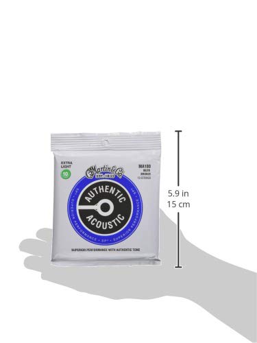 Martin Authentic Acoustic Strings provide unrivaled quality, craftsmanship, and tone for your acoustic guitar. Designed to produce a true, consistent tone, these extra-light-gauge strings provide excellent tuning stability and playability so your guitar can thrive during your rigorous practice and performance schedule. Made from 80/20 bronze, these strings feature Martin's highest-quality wrap wire for enhanced longevity and durability. They are naturally corrosion resistant, so they will hold up after hours and hours of playing. This total pack of professional-grade guitar strings will last through long jam sessions, late-night campfire songs, and plenty of picking. To make these strings extra-durable and stable, we start with our highest-tensile-strength core wire and then tin-plate it on all 12 strings for added corrosion resistance. When the core is coupled with our highest-quality wrap wire, you get a consistent tone that you can count on song after song. Designed to bring out your guitar's true tone, these bronze guitar strings can be used for finger-style blues, rock, Americana, country, bluegrass, ragtime, and many more styles. With this pack, you'll receive 12 extra-light-gauge guitar strings. The low E strings measure 0.047" and 0.027”, the A strings measure 0.039" and 0.018”, the D strings measure 0.030" and 0.012”, the G strings measure 0.023" and 0.010”, the B strings both measure 0.014", and the high E strings both measure 0.010". This total set of extra-light-gauge strings features a tension of 261.7, and they make it easy to get a rich, bright tone out of your guitar. Martin Guitar has been producing high-quality, musician-choice guitars and guitar accessories since 1833. The Martin Authentic Acoustic Extra-Light-Gauge Guitar Strings are the real deal—not an imitation. Discover your guitar's true voice with this professional-grade guitar string pack.