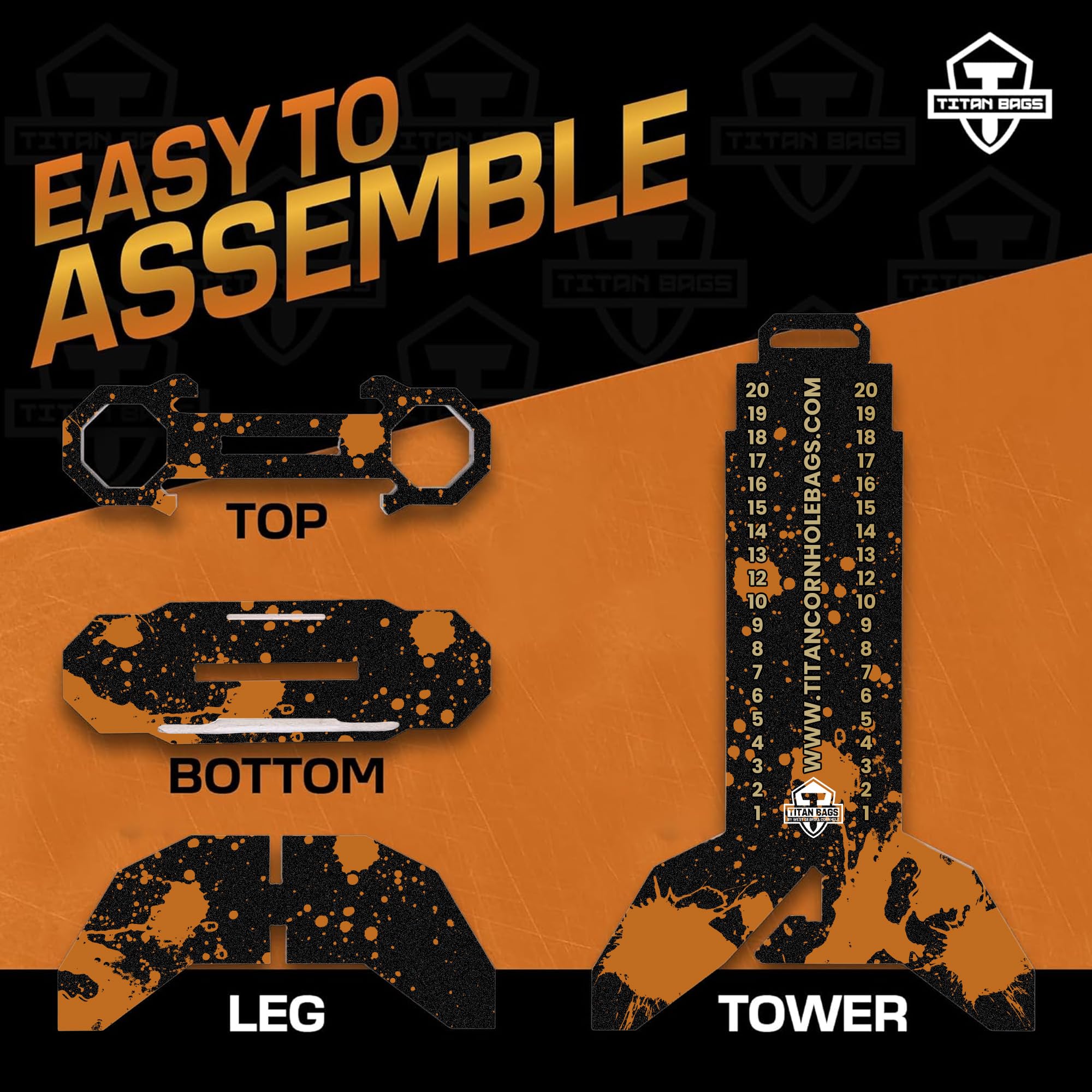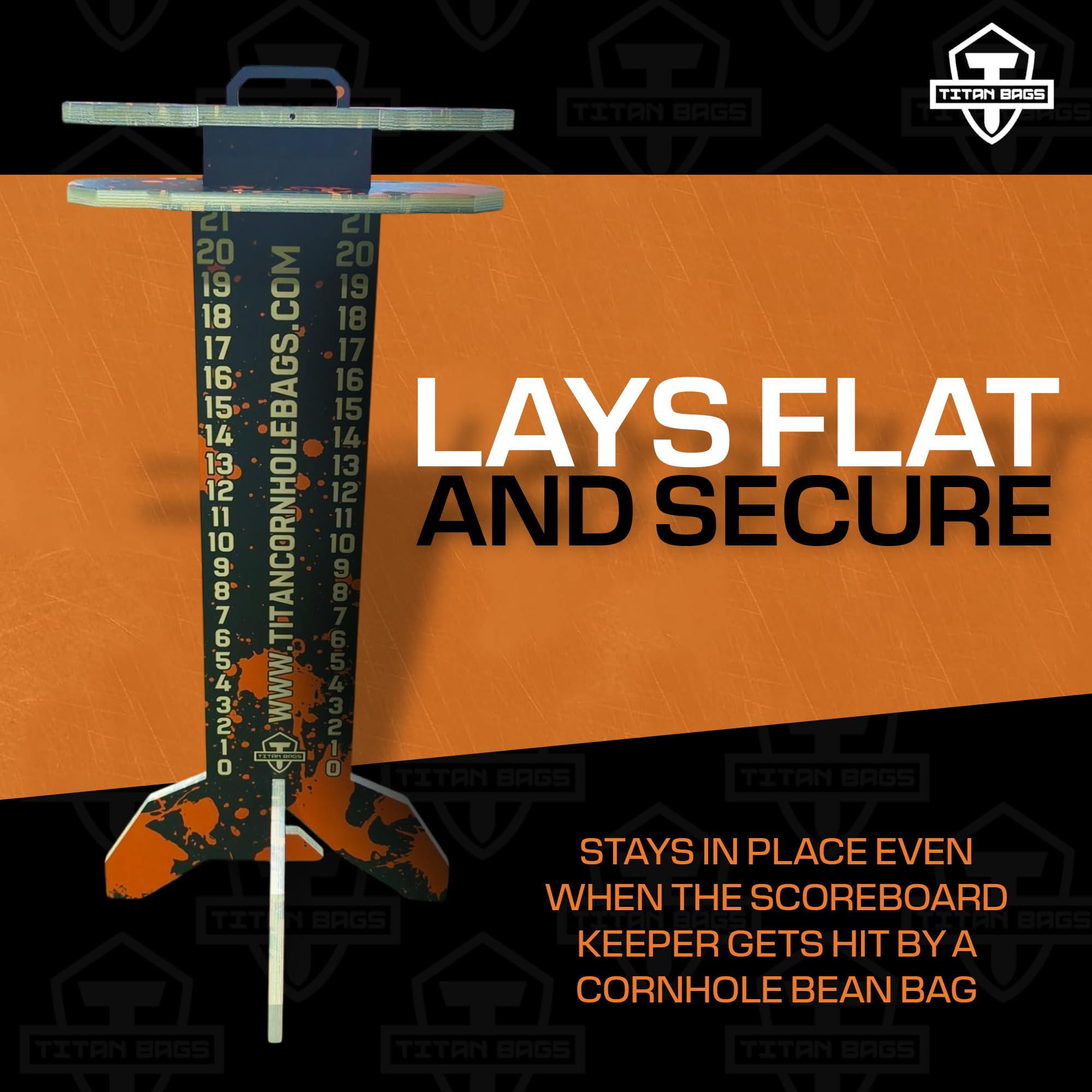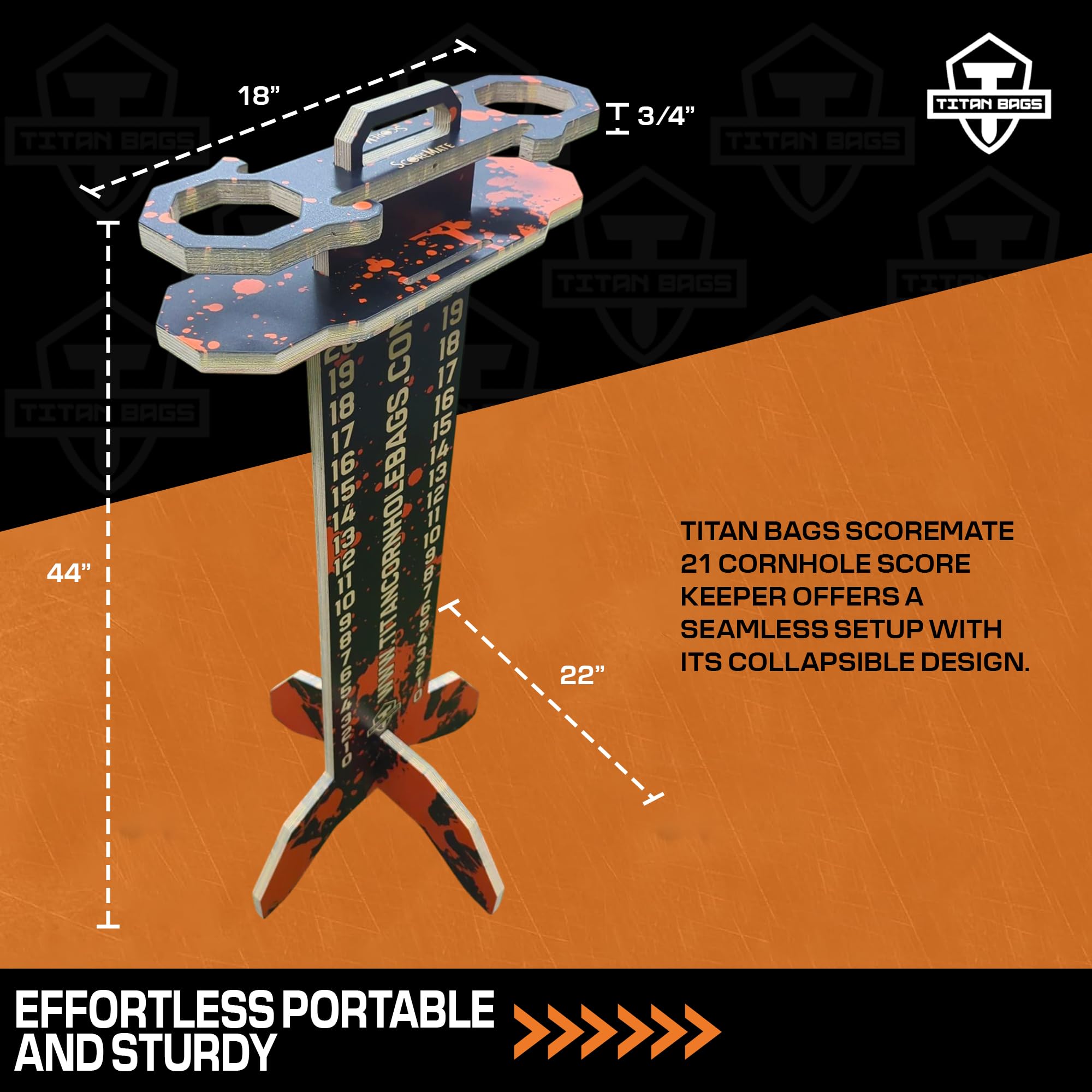 EFFORTLESSLY PORTABLE & STURDY: Titan Bags ScoreMate 21 cornhole score keeper offers a seamless setup with its collapsible design. It is made of 3/4" baltic birch plywood that stands 44" tall. At the base it measures 22" across making it very strong and supportive. The top region measures 18" across allowing plenty of room for your devices and drinks on your games