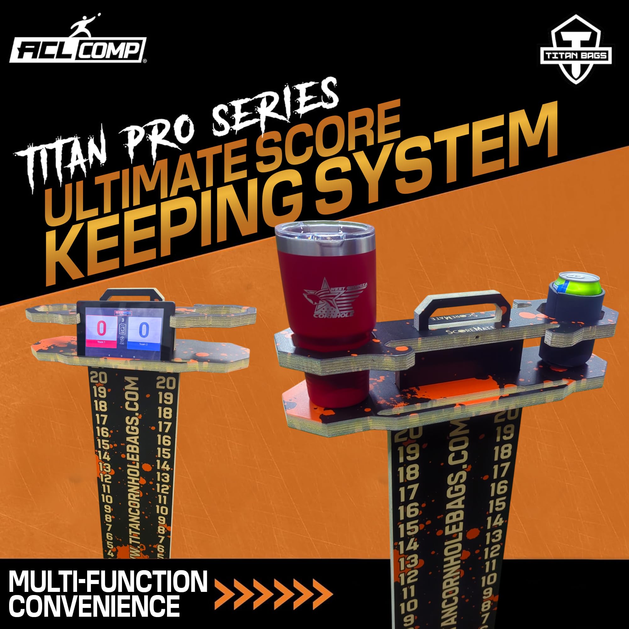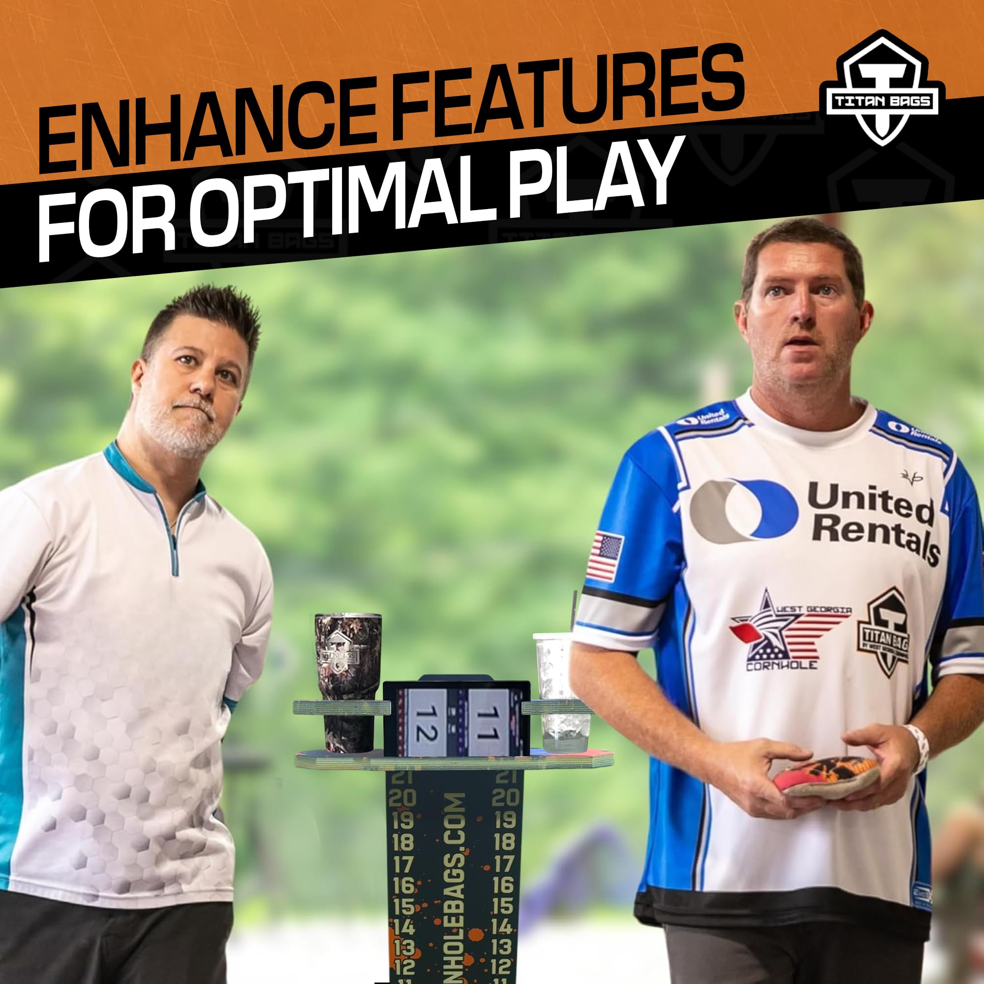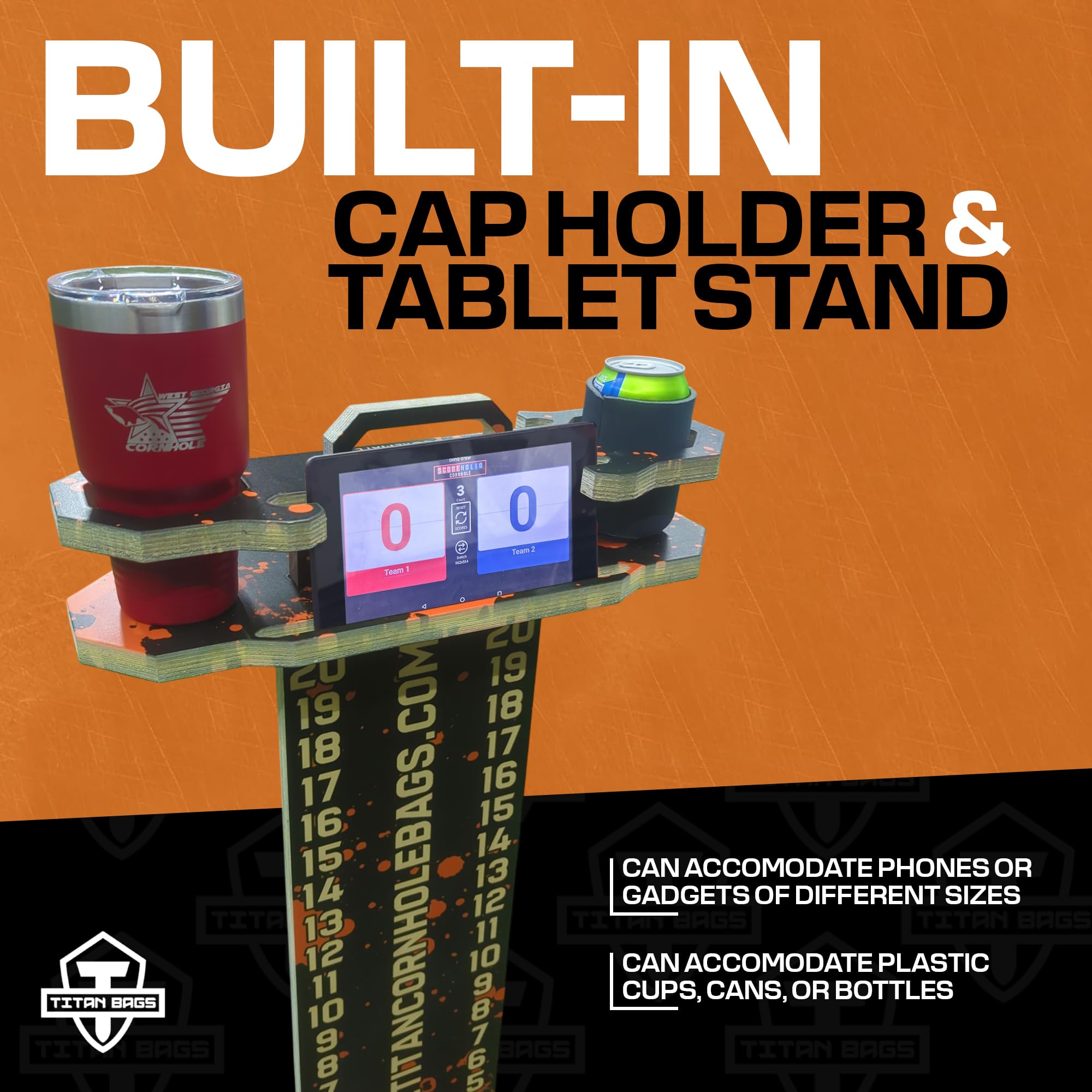 ENHANCED FEATURES FOR OPTIMAL PLAY: Our corn hole score keepers boast two spacious cup holders designed to fit 30oz tumblers, an integrated slot for securely holding tablets, phones, and scorecards, and dual scoring clips with a number strip printed on both sides of the upright for easy visibility.
