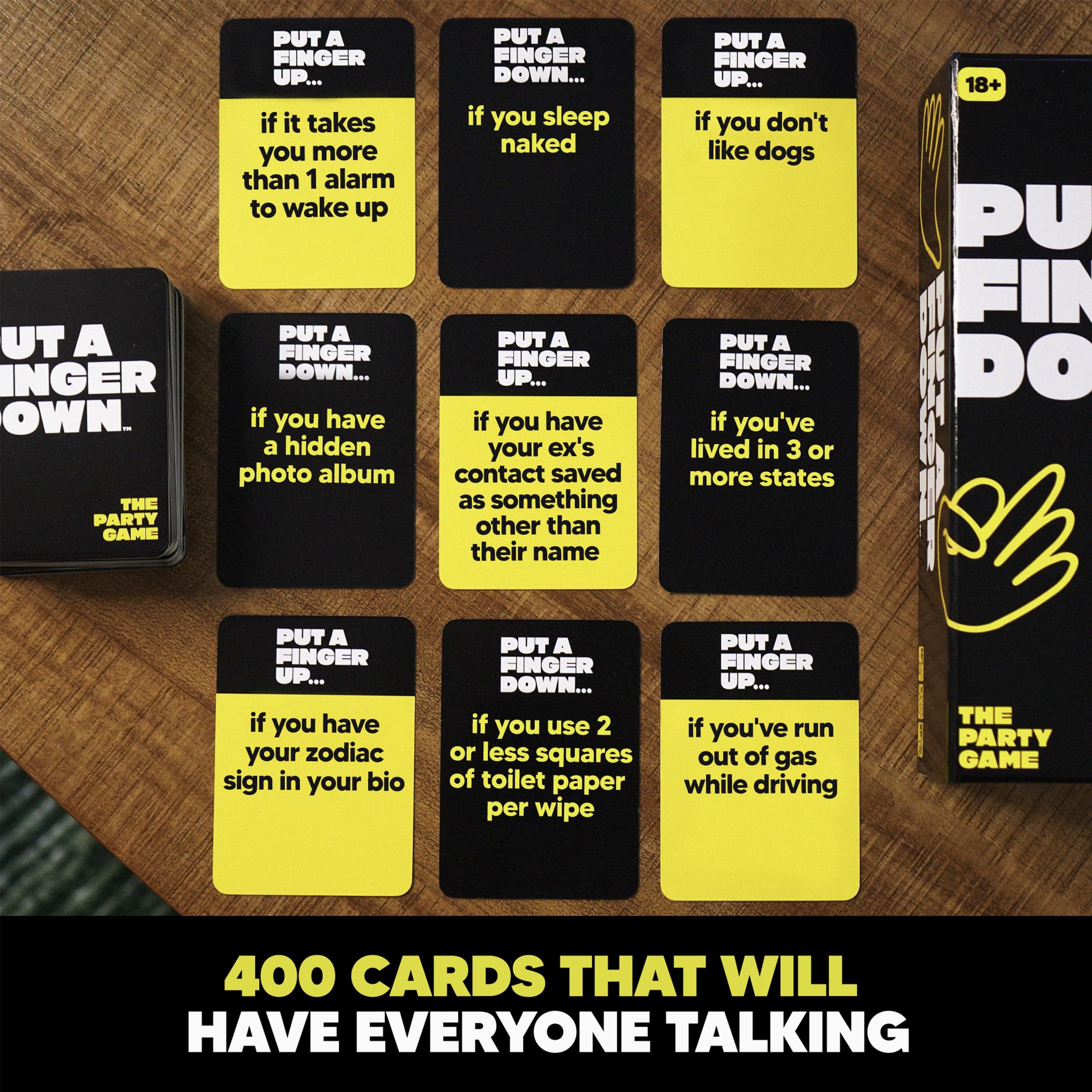 Put A Finger Down is the perfect party game to spice up any occasion! The game is simple: hold up five fingers and read the cards aloud. If it’s a DOWN card and applies to you, put a finger down. But! If it’s an UP card and you’re *that* person, take the L by putting a finger up. First with all their fingers down wins. Fun for any group size and simple to play, Put A Finger Down is the card game that will have everyone laughing.