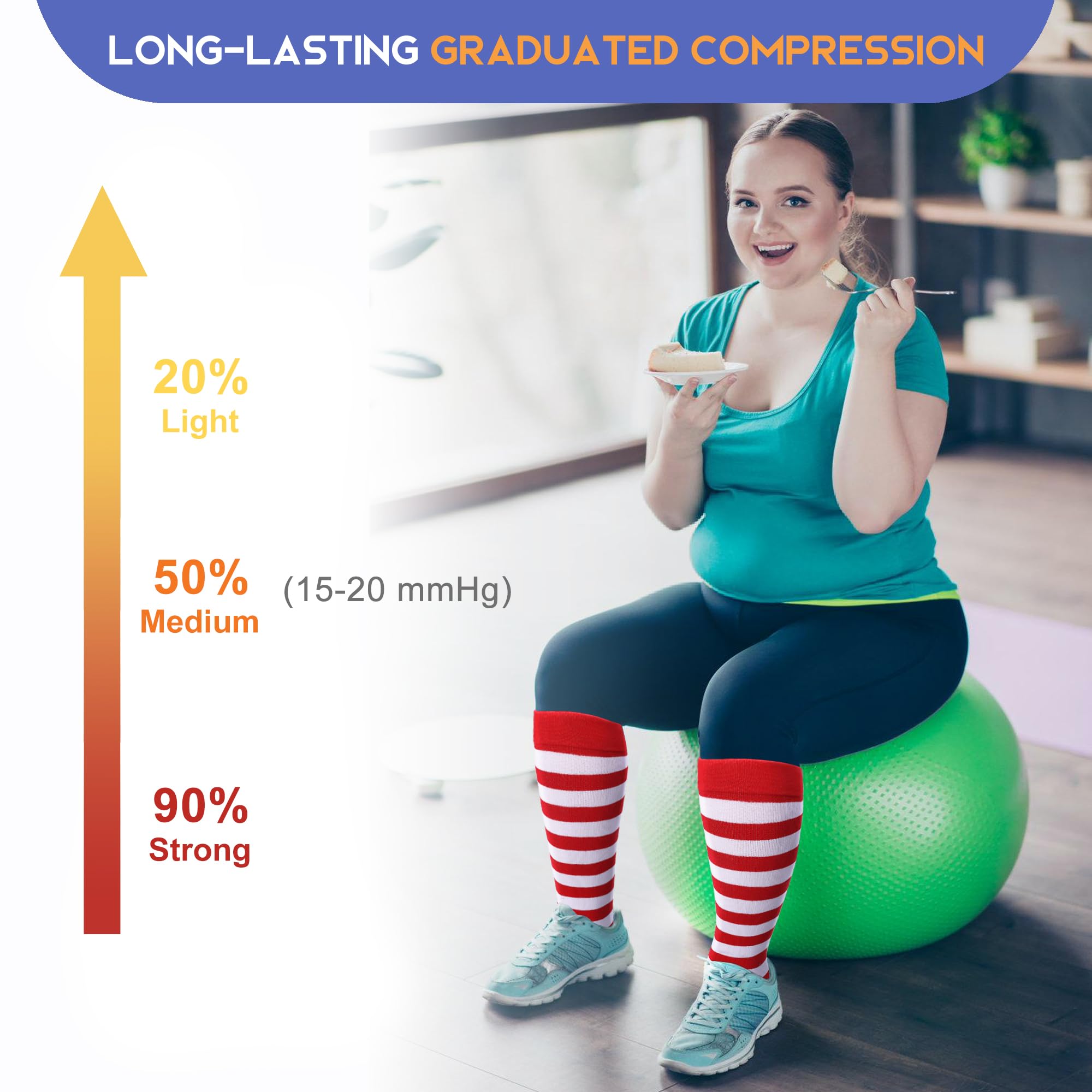 Plus Size Compression Socks Wide Calf: These wide calf compression socks are designed for people with wider calves, providing excellent leg support and long-lasting graduated compression. They are easy to put on and take off and won't roll down or cut into your leg due to their 360° stretchy and wide cuff. They are also durable and comfortable to wear.