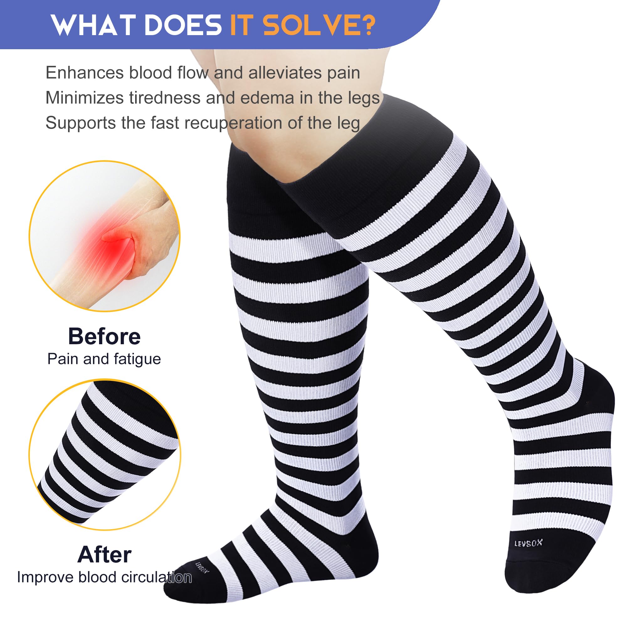 Compression Socks for Women Plus Size: High-quality plus size compression socks are offer a compression grade of 15-20 mmHg. These socks effectively alleviate a range of blood circulation issues, including edema, lymphedema, neuropathy, blood clots, surgery, hypertension, swelling, muscle and leg pain, cramps, fatigue, and varicose veins.