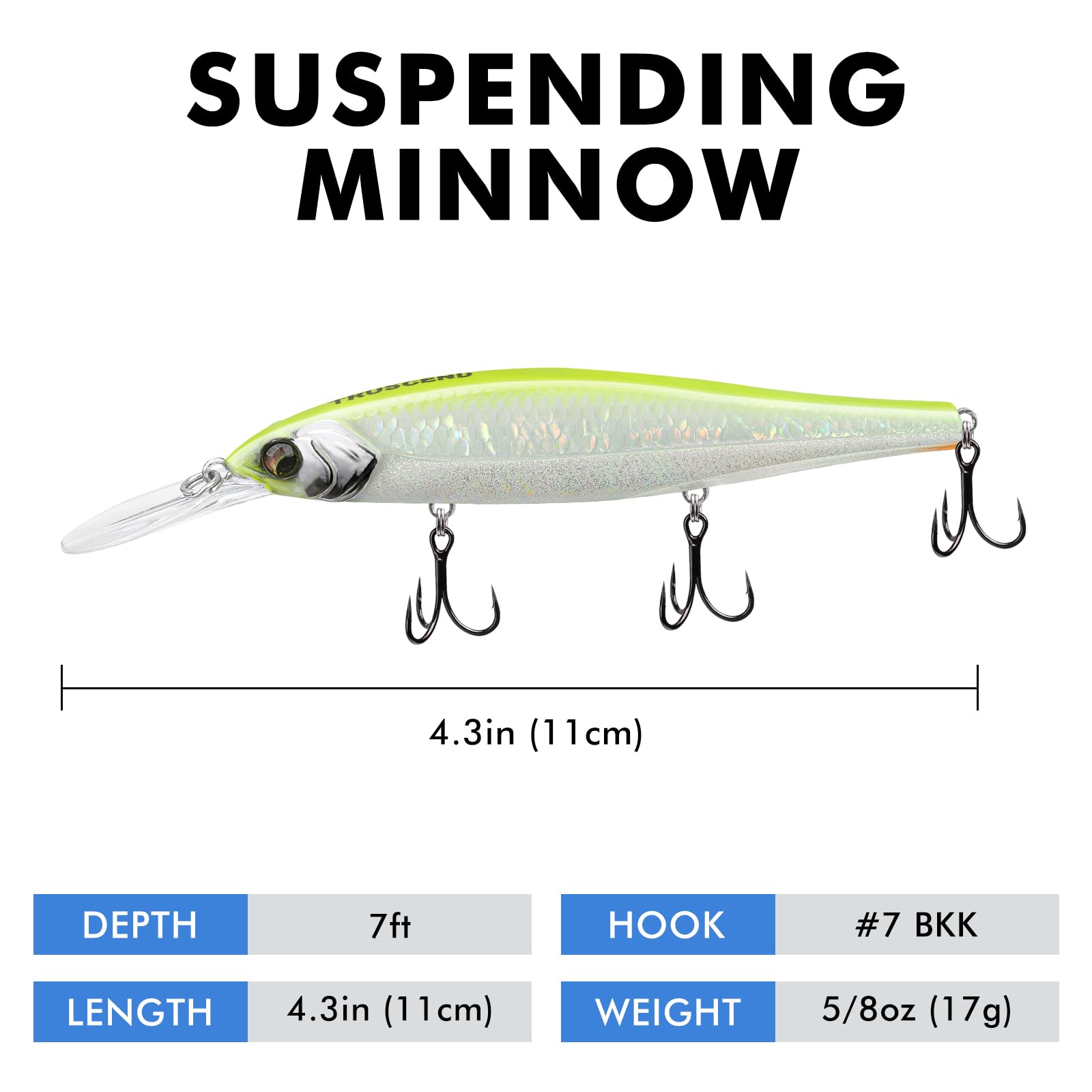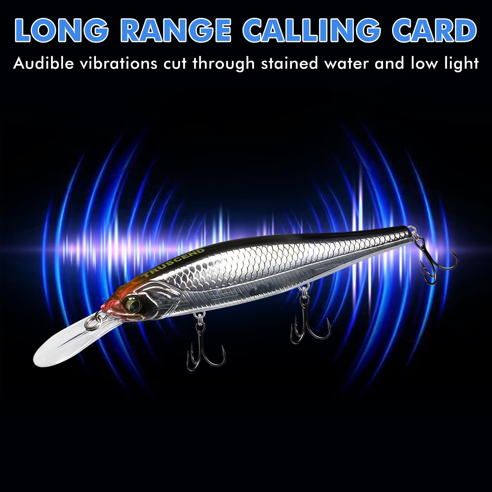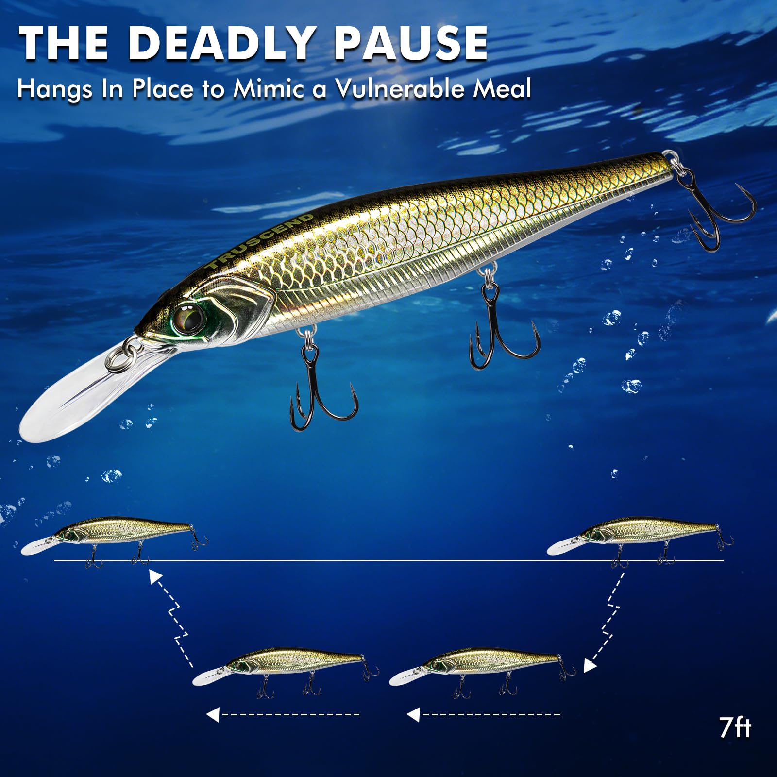 SUSPENDING FEATURE CREATES EASY CATCH: This TRUSCEND Suspending minnow can dive within 6-7 feet. Its true suspending nature allows you to work the lure to an exact depth and keep it there. Simply crank it down to the target zone and use a twitch-pause cadence to make it dance right where the fish are holding, dramatically increasing your presentations in the prime strike window.