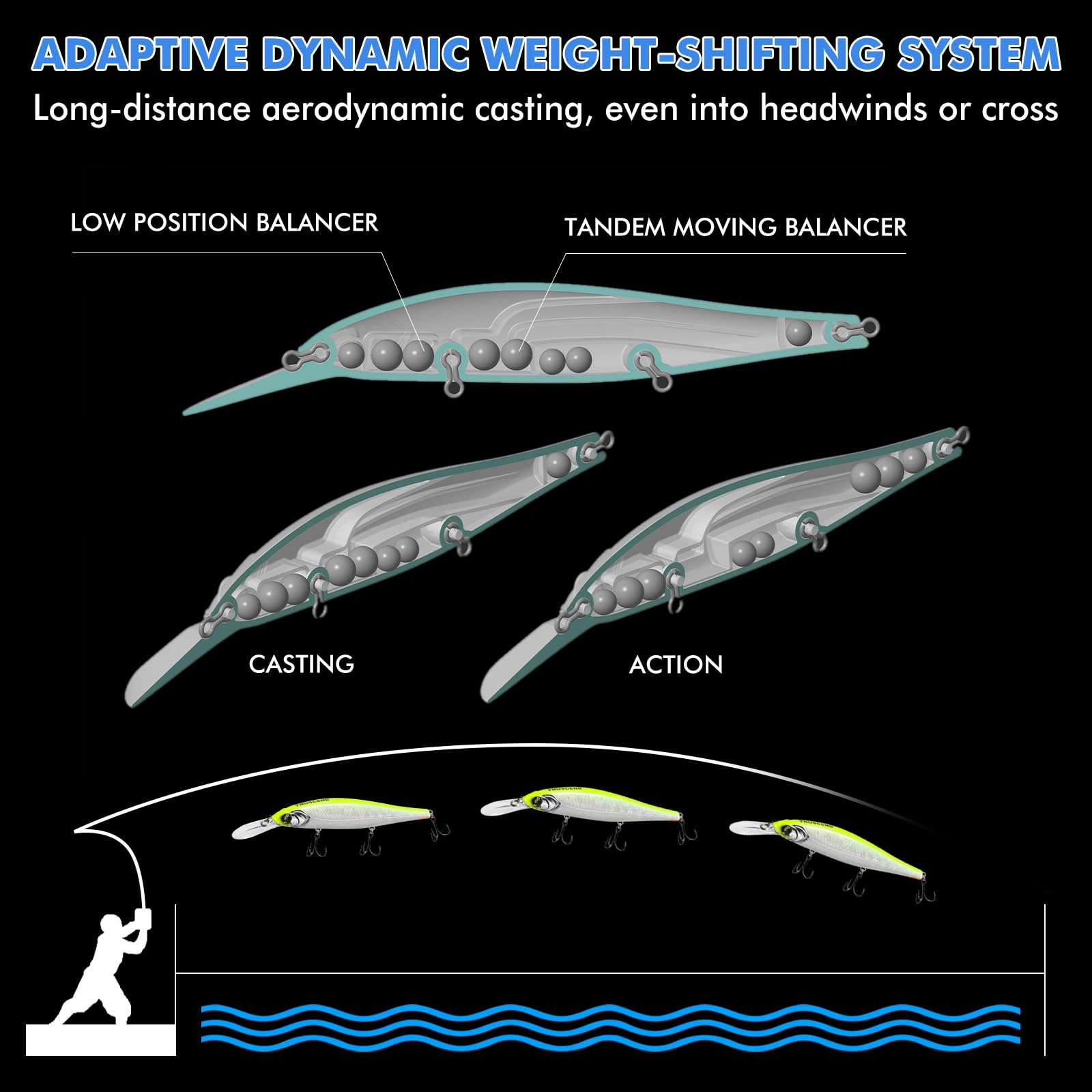 OPTIMIZED WEIGHT TRANSFER: TRUSCEND Minnow Lure feature an internal weight transfer system. This technology enable the movable weight ball inside the body to improve the casting distance, accuracy, and in-water balance. Concentrates the lure's mass and shifts it towards the tail, acting like a pendulum.