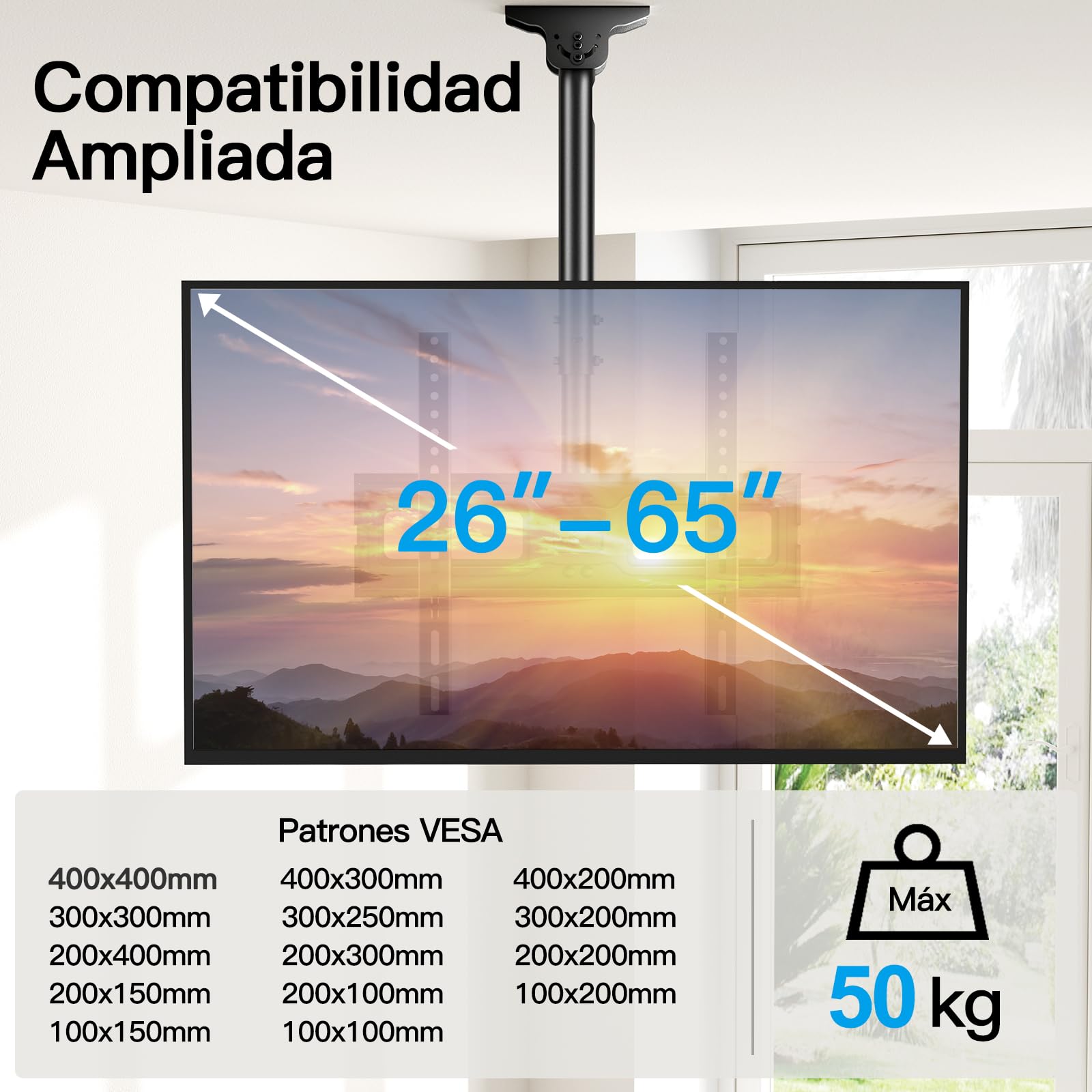 WIDE COMPATIBILITY- This TV ceiling mount fits most 26-65 inch flat screen TVs with VESA 100×100 mm (4"×4") to 400×400 mm (16"×16"), holding up to 110 lbs/50 kg, Please check the TV weight, VESA pattern before purchase. Compatible with wood stud, concrete, and brick wall mounting. Do not install the mount on drywall alone.