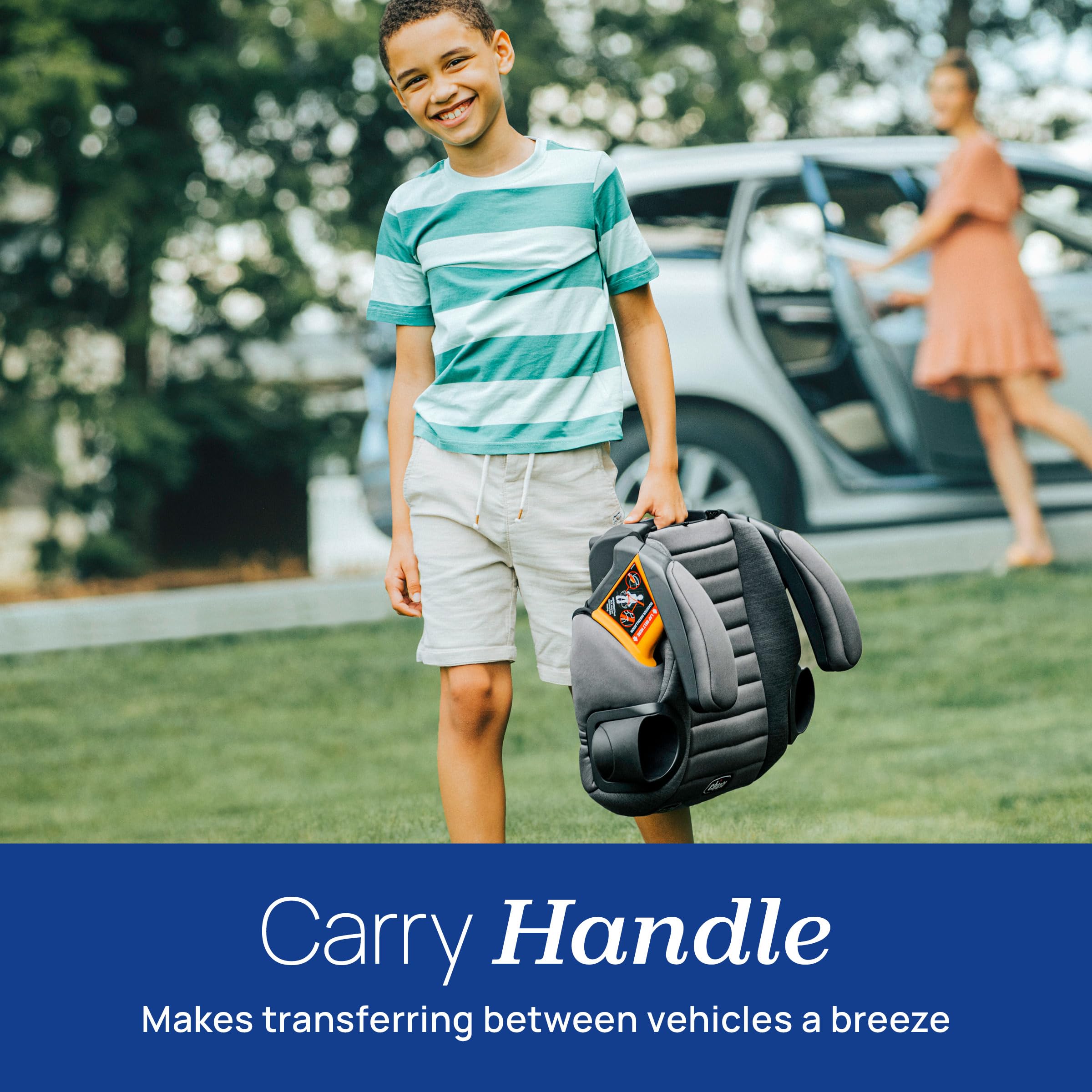 BUILT-IN CARRY HANDLE — Easy to transfer the child booster seat from vehicle to vehicle. This model does not have LATCH attachment. See GoFit Plus Backless Booster for the same booster with LATCH attachment plus quick-release LATCH removal.
