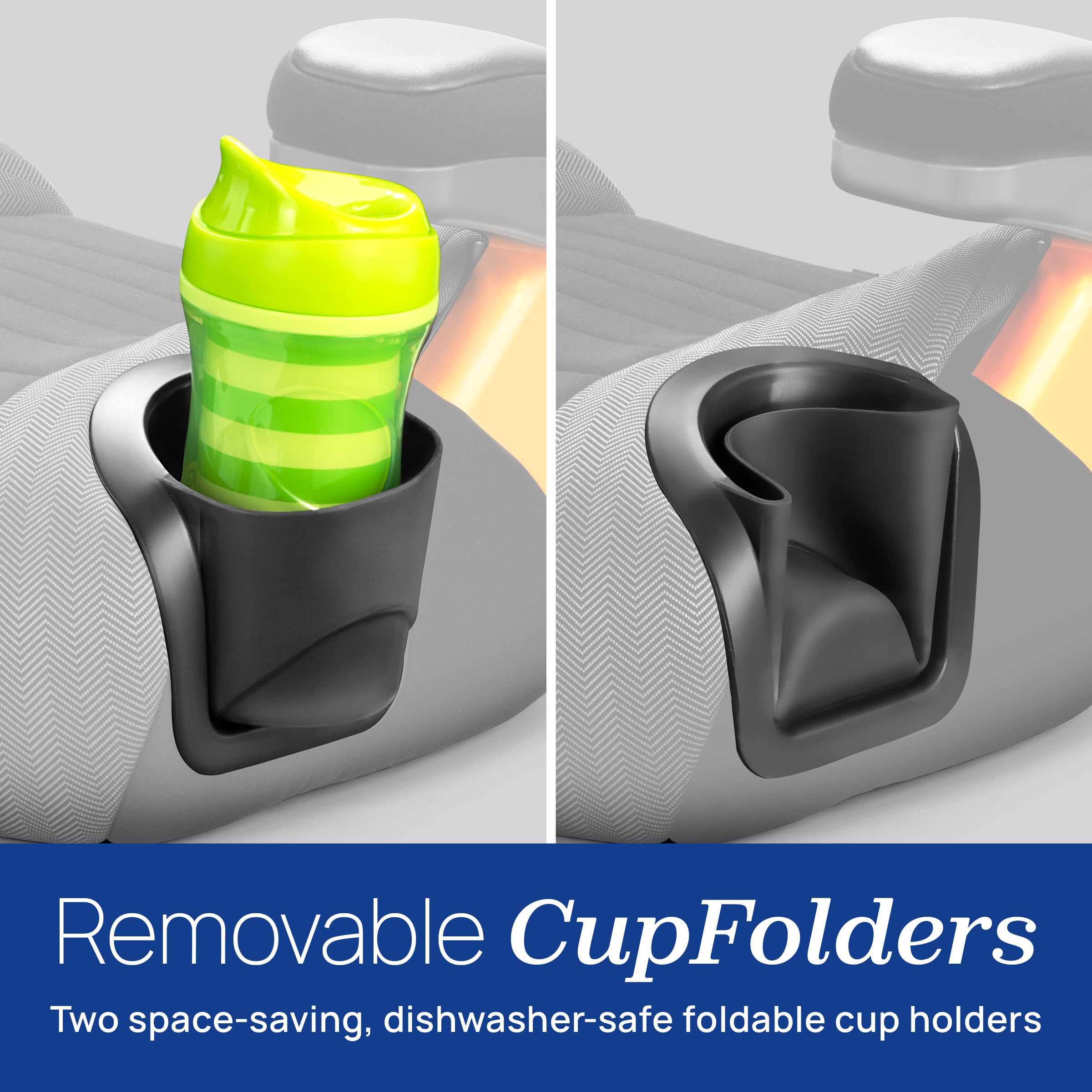 EASY CARE — The GoFit portable booster seat features 2 dishwasher-safe, fold-away cup holders, a machine-washable seat pad and pop-out armrest covers for easy cleaning. The foam insert may be hand rinsed and hung to dry.