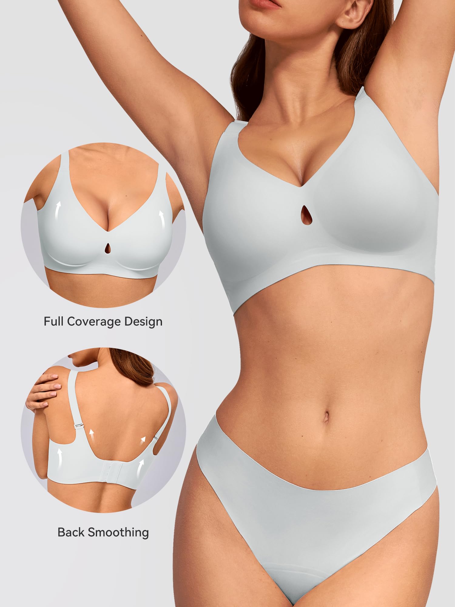 SEAMLESS BRAS WITH SUPPORT AND LIFT: These plus size bras for women provide full coverage, support, and lift. The V-neck design accentuates the bust line and the low-cut design shows charming curves. The teardrop cutout at the center keeps you cool and comfortable 24 hours a day. This women's everyday t-shirt bra for women is lightweight, invisible, and non-see-through, which fits your breasts perfectly and gives you a smooth look under your clothes.
