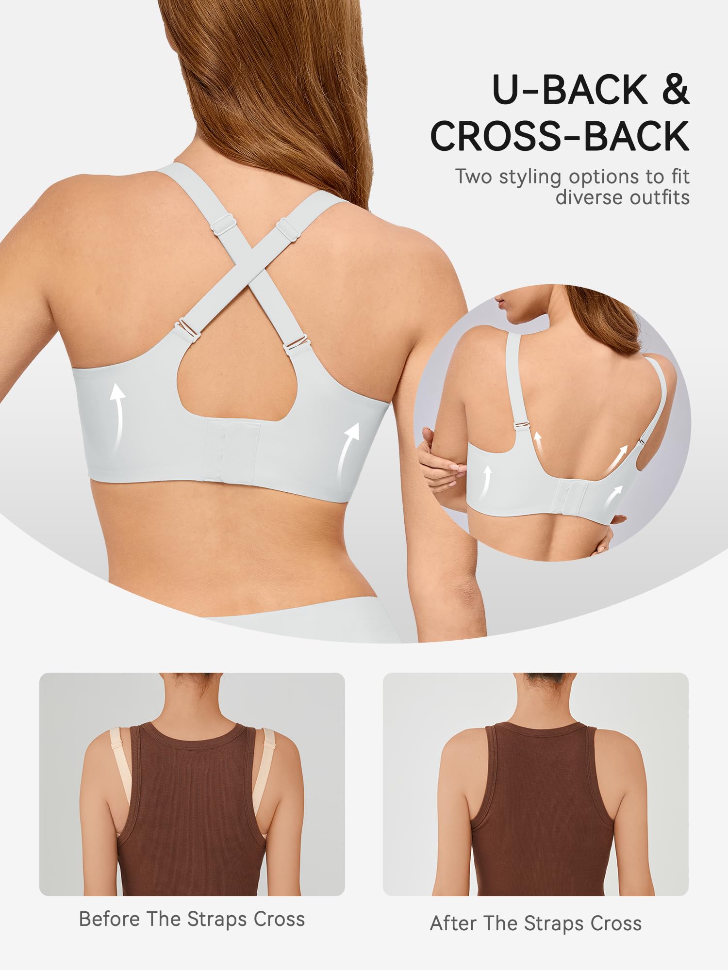 INVISIBLE U-BACK AND CROSSABLE STRAPS: These wireless bras for women comes with adjustable elastic straps that you can cross to achieve a better lift, paired with four rows of three-button hooks that allow you to customize the fit to your body shape. With a U-back design and wide side straps, this seamless bras helps to conceal underarm bulges and back fat for extra support and a smoother silhouette, making it one of the best bras to hide back fat.