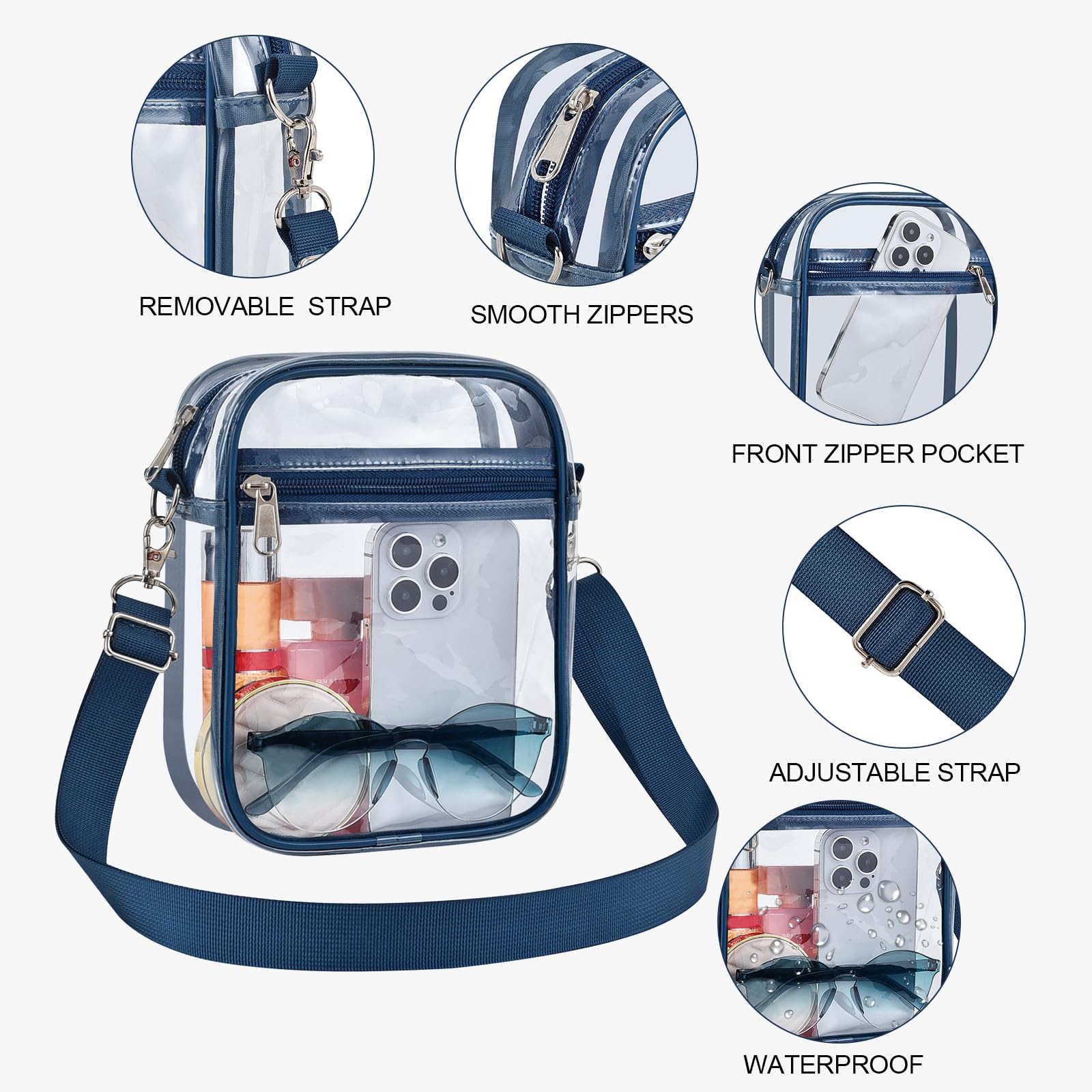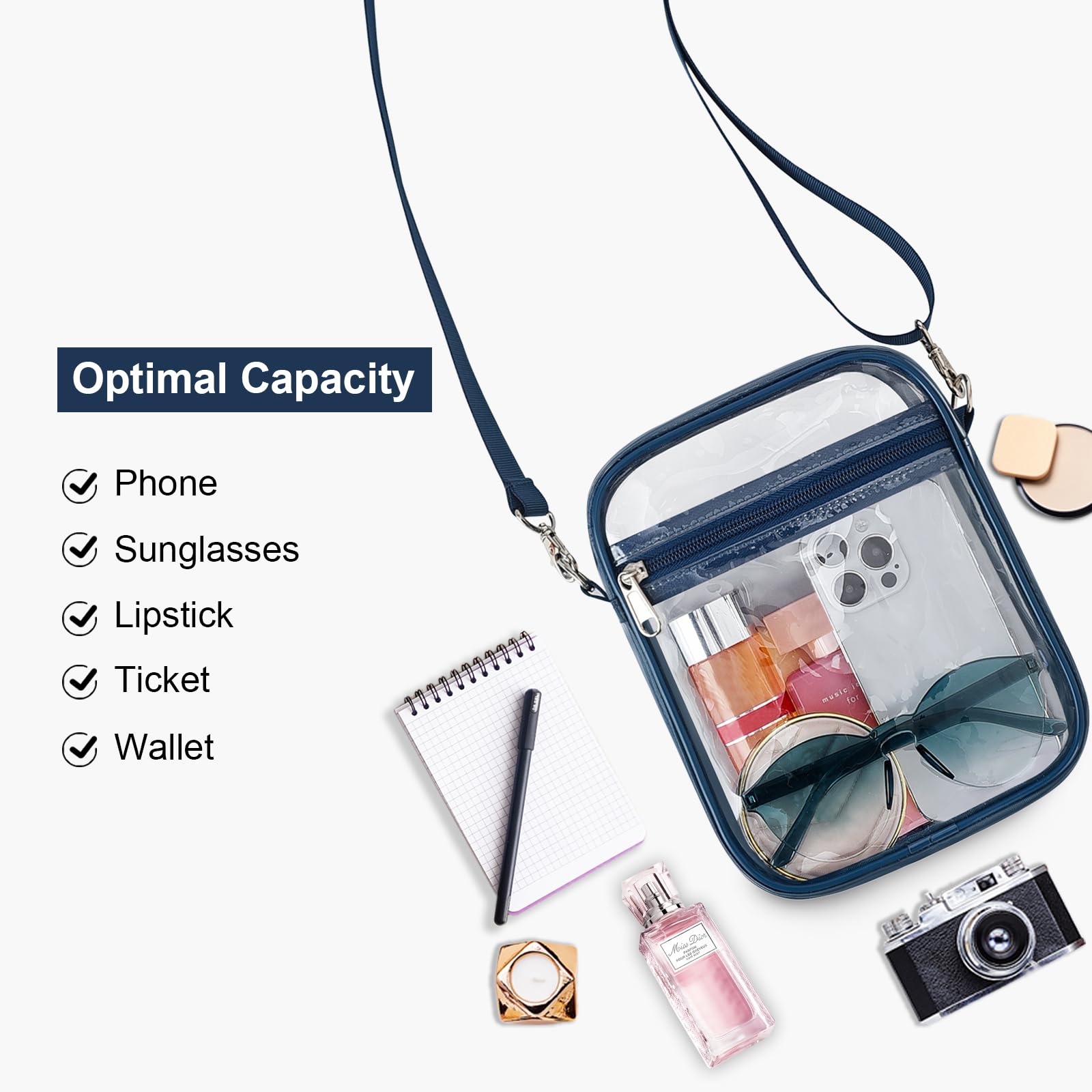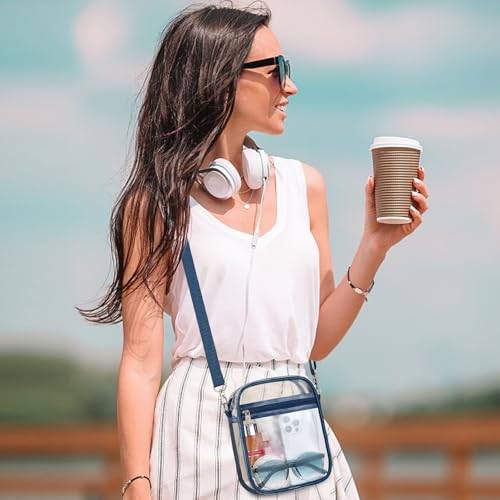 【Suitable Capacity】One main compartment can hold a small wallet, phone, lipstick, pen, tissues, and sunglasses, while the front pocket can hold keys, cash, cards, and tickets, making our clear bag an essential for your concert outfit.