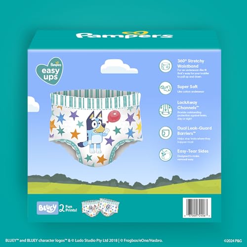 Start your potty training journey with Pampers Easy Ups Potty Training Underwear for Girls and Boys! Featuring your favorite characters – Bluey and My Little Pony - these super soft, comfortable, and breathable training pants fit just like real cotton underwear allowing your toddler to feel like they have transitioned out of diapers! With a 360 stretchy waistband that is gentle on your child's skin, Easy Ups make it easy for your toddler to pull up and down their training pants independently. For easy changing, Easy Ups feature easy tear sides for convenience, even on the go! When it comes to potty accidents, your toddler will be covered with up to 100% leakproof protection Day OR Night. To protect where leaks happen most, Easy Ups are made with Dual Leak-Guard Barriers around the leg cuffs and Extra Absorb Channels for all around coverage to absorb accidents and lock them away from your toddler's skin. Plus, they're dermatologically tested, hypoallergenic, and free of parabens and latex.* That's just one of the many reasons Pampers is the #1 pediatrician recommended brand. Toilet training is a journey and can take your toddler 90 days on average to catch on. So, Pampers Easy Ups makes it easy with each box containing a one-month supply of training pants. Available in sizes 2T-3T (16-34 lb), 3T-4T (30-40 lb), 4T-5T (37+ lb) and 5T- 6T (41+ lb).*Natural Rubber
