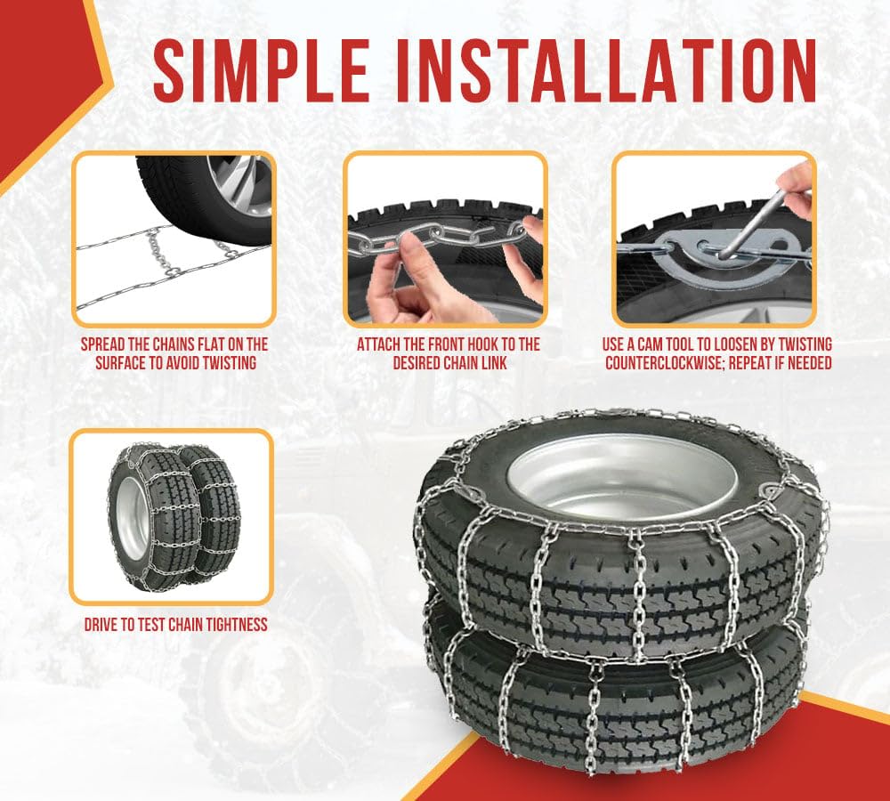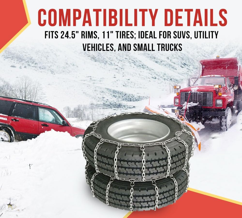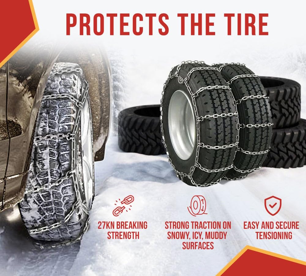 Want to be prepared before the winter season hits hard? Here’s Mytee Products’ Dual Square Link Snow Tire Chains w/ Cam Fits 24.5" Rim Dia. Tires (Set of 2). This snow chain will cover two tires at a time, providing a smoother ride, firm grip, and strong traction on snowy, icy, muddy surfaces. It will prevent tires from cuts, damage, and jarring. The design is ideal for SUVs and passenger vehicles of compatible sizes can also utilize these tire chains. Want to know how this product can save you from accidents and unforeseen situations? Scroll down below:- Durable Construction: We have engineered these chains from steel, following its durability and strength in different environments. It will ensure resistance to wear, maintain the shape of the material, and reduce the likelihood of stretching or deformation over time. It has a breaking strength of up to 27KN. Square Links: The uniformed links are for better traction and improved efficiency. It’s in ladder style for a smoother ride on icy and snowy surfaces. The square shape will seamlessly work on hard-packed ice, biting into the surface more effectively. It protects the tire from cuts and damages, ensuring a firm grip on the road. It has 5-link spacing for better traction and improved chain tension. Cam Tensioner: The square link tire chain features a cam tightening system for easy and secure tensioning. It will enable you to adjust the chain and ensure a snug fit around the tire, keeping it intact and preventing the chain from loosening during movement. You have to do it manually after completing the installation. Compatibility: These truck snow chains are designed to provide compatibility with a 24.5" rim diameter and 11" wide tire. It will seamlessly fit to vehicle sizes of 285/75R24.5 and 11R24.5. These are commonly used on SUVs, low-duty trucks, compact utility vehicles, and smaller trucks. Safety Tool: Our winter chains are suitable for off-road and icy terrains where your truck will need additional traction. It will prevent slipping or slacking during frequent stops. Truckers/drivers can carry these chains and secure them in tool boxes. Simple Installation: The process is simple, and it will not take much time. We are providing a dual set of 2 chains for front and rear tires. Follow the steps below:- Spread the chains flat on the surface to avoid twisting. Ensure to keep the cams on the accessible side for adjustments. Take the chain and drape them over the tire. Place it nice and even. For the first connection, attach the hook (behind the tires) to the other side of the desired link for the perfect fit. Attach the front hook to the desired chain link (the farthest one you feel is the best). Adjust a little slack with cams—utilize a cam tool and twist in the anti-clockwise direction. If needed, follow the process with other cams. Add a rubber spider bungee to keep your chain from slipping or coming loose. Usage Guidelines: Follow the specified speed limit of 30 mph for safety. Do not use on bare pavement to avoid damage to tires and the road. Clean and dry the chains to prevent rust. Also, store it in a dry place. It’s suggested that the chains be installed before driving. As it might get difficult amid heavy and deep snowy areas.