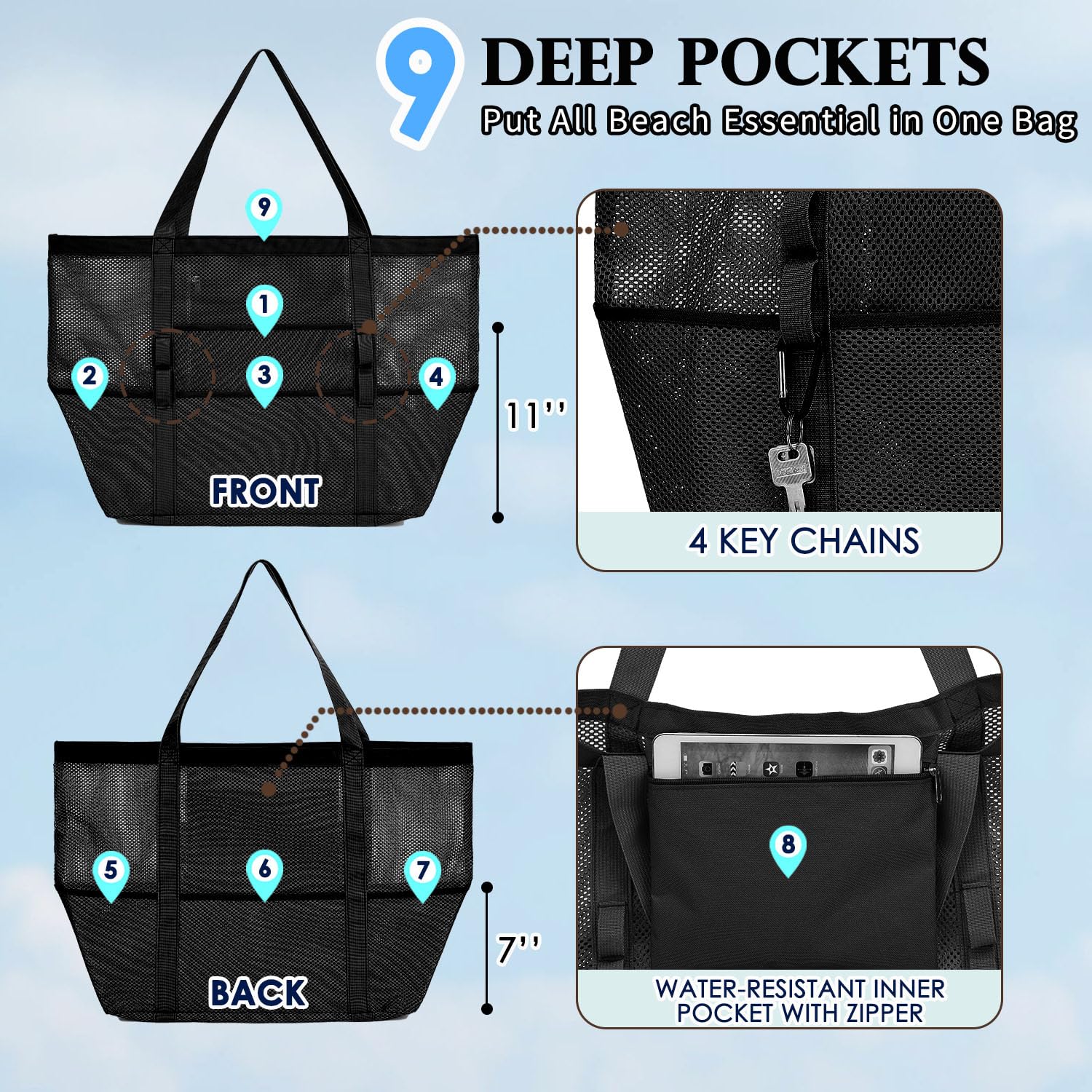 ๐๏ธใ๐ ๐๐๐ซ๐ ๐ ๐๐๐ฌ๐ก ๐๐จ๐๐ค๐๐ญ๐ฌ & ๐ ๐๐ฉ๐ฅ๐๐ฌ๐ก-๐ฉ๐ซ๐จ๐จ๐ ๐๐ข๐ฉ๐ฉ๐๐ซ ๐๐จ๐๐ค๐๐ญใThis beach bag for women and men features multiple compartments, suitable for storing various items, making it easy to keep belongings organized and categorized. In addition, there is a splash-proof internal zipper pocket, providing additional secure space for storing smaller or more private items. This design allows users to conveniently organize and store items, enhancing user experience.