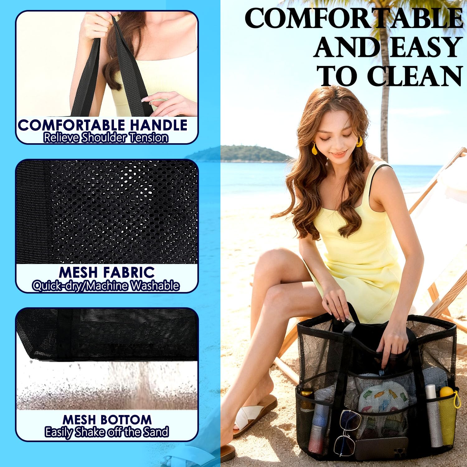 ๐๏ธใ๐๐ฎ๐ซ๐๐๐ฅ๐ & ๐๐จ๐ซ๐ญ๐๐๐ฅ๐ใThis mesh towel bag is constructed from sturdy 600D polyester and tear-resistant mesh materials, and the reinforced stitching further ensures exceptional durability, allowing it to withstand loads of up to 160 lbs. This beach must haves is lightweight, collapsible and easy to carry. The 9-inch long shoulder strap of this beach tote for women adds a significant comfort factor to its transportation.