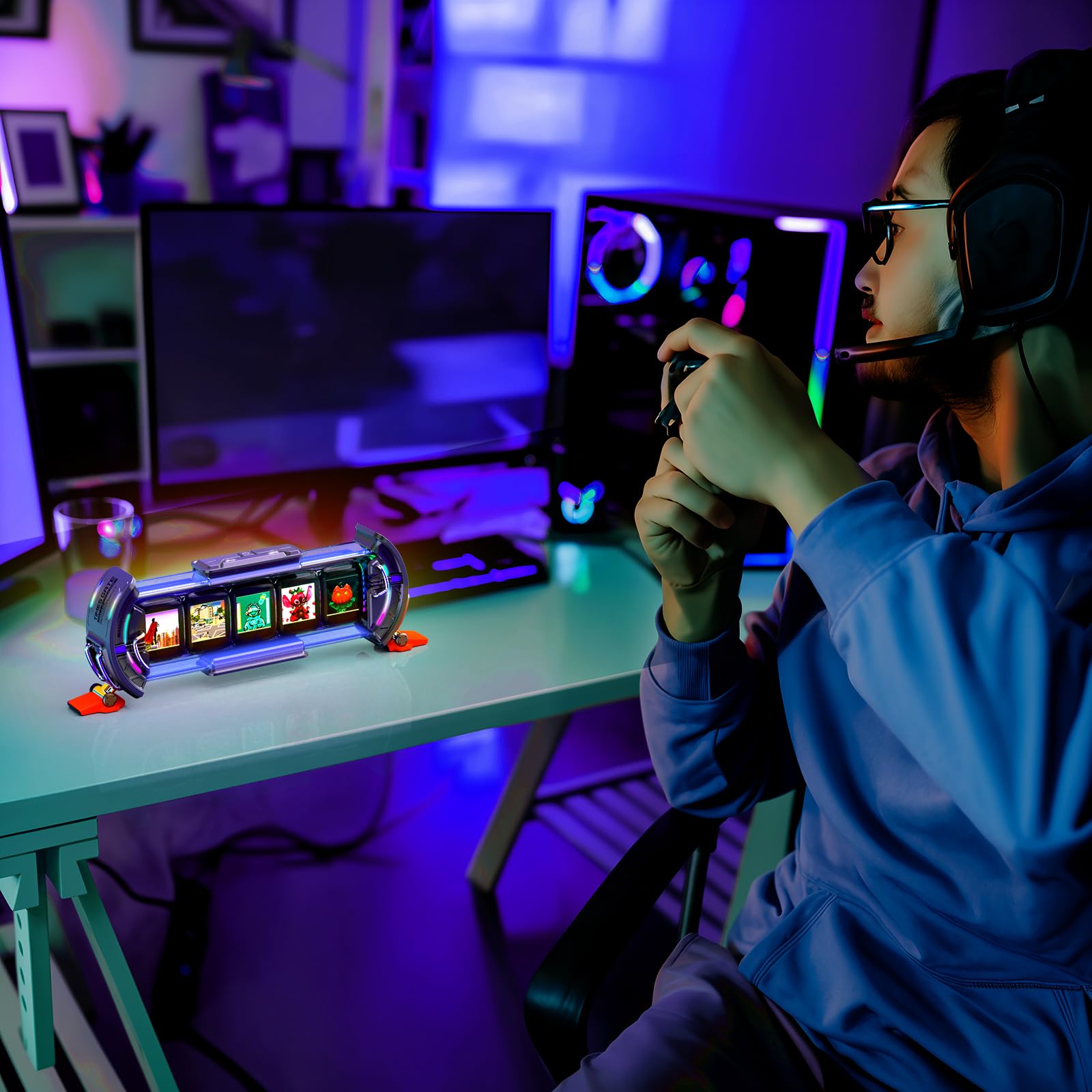 【Divoom Times Gate】 -- The Times Gate Cyberpunk Digital Clock draws inspiration from the realm of future technology, It transcends being a mere digital clock; it is a magnificent tapestry interwoven with light, shadow, and creative expression. featuring five full-color LCD displays, with dazzling 128x128 pixel art and lively animated GIFs, brings a unique visual extravaganza to your gaming room, office.Product dimensions: 283×47× 97mm