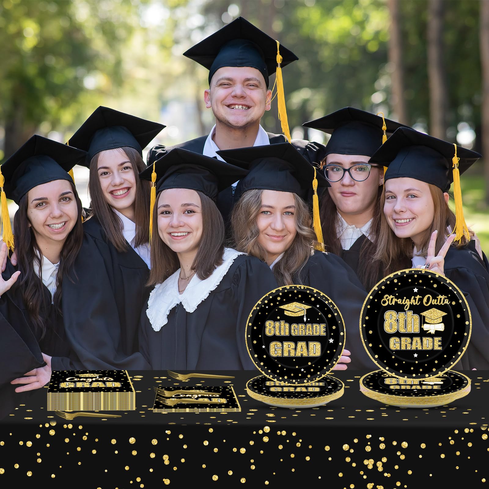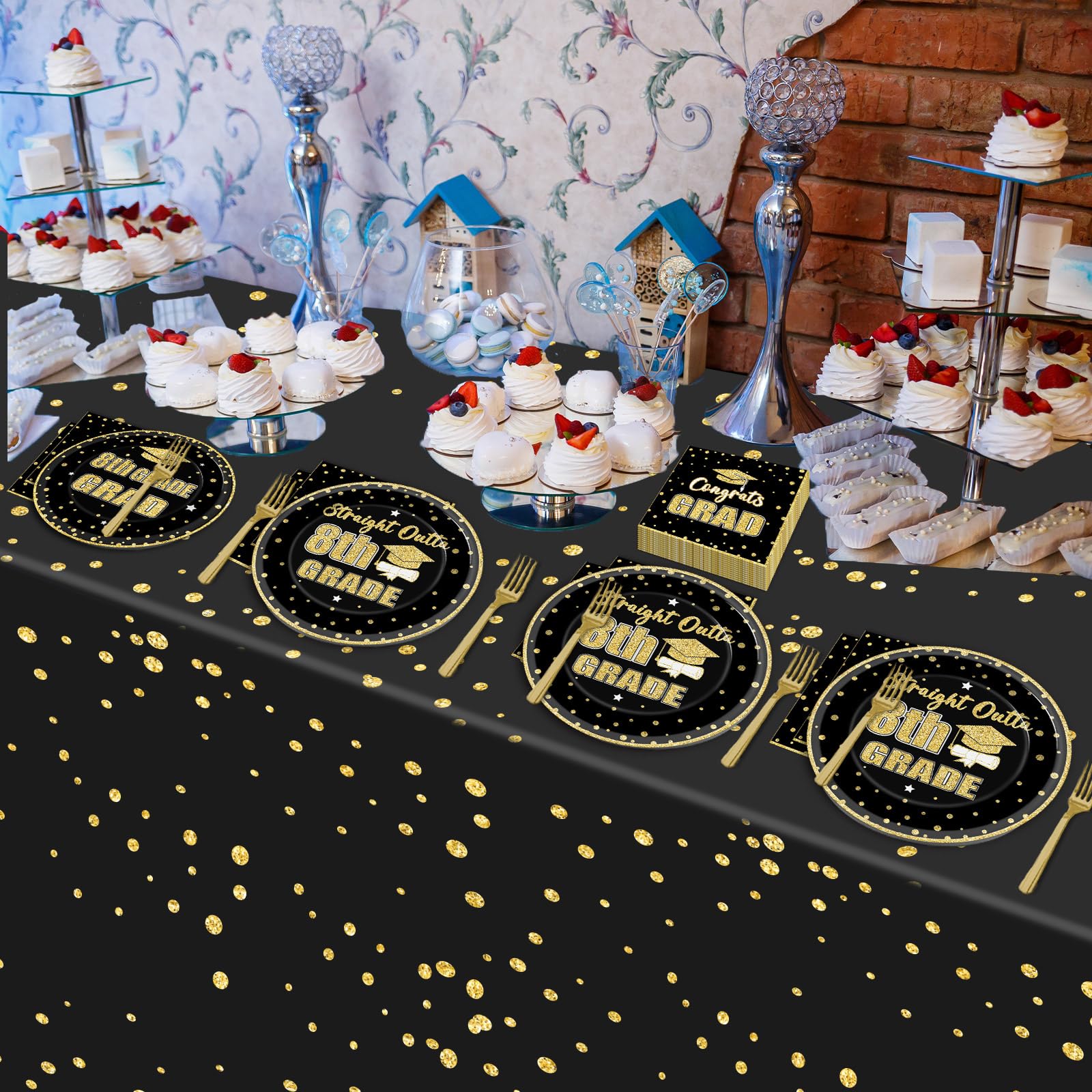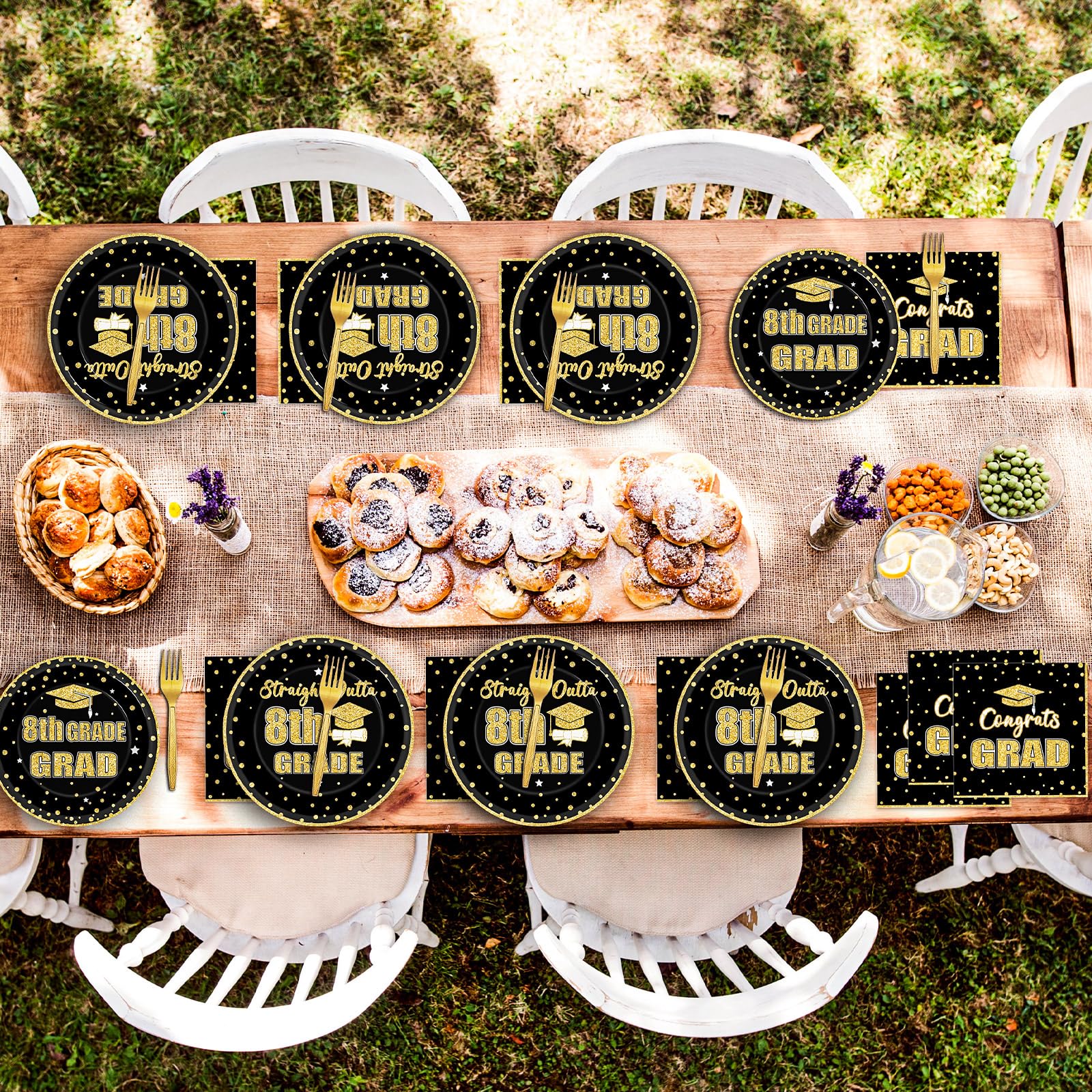 Great graduation decorations: our graduation theme paper plates and napkins are all designed in black gold color and 8th grade patterns. Which can make your party full of the joyful atmosphere.