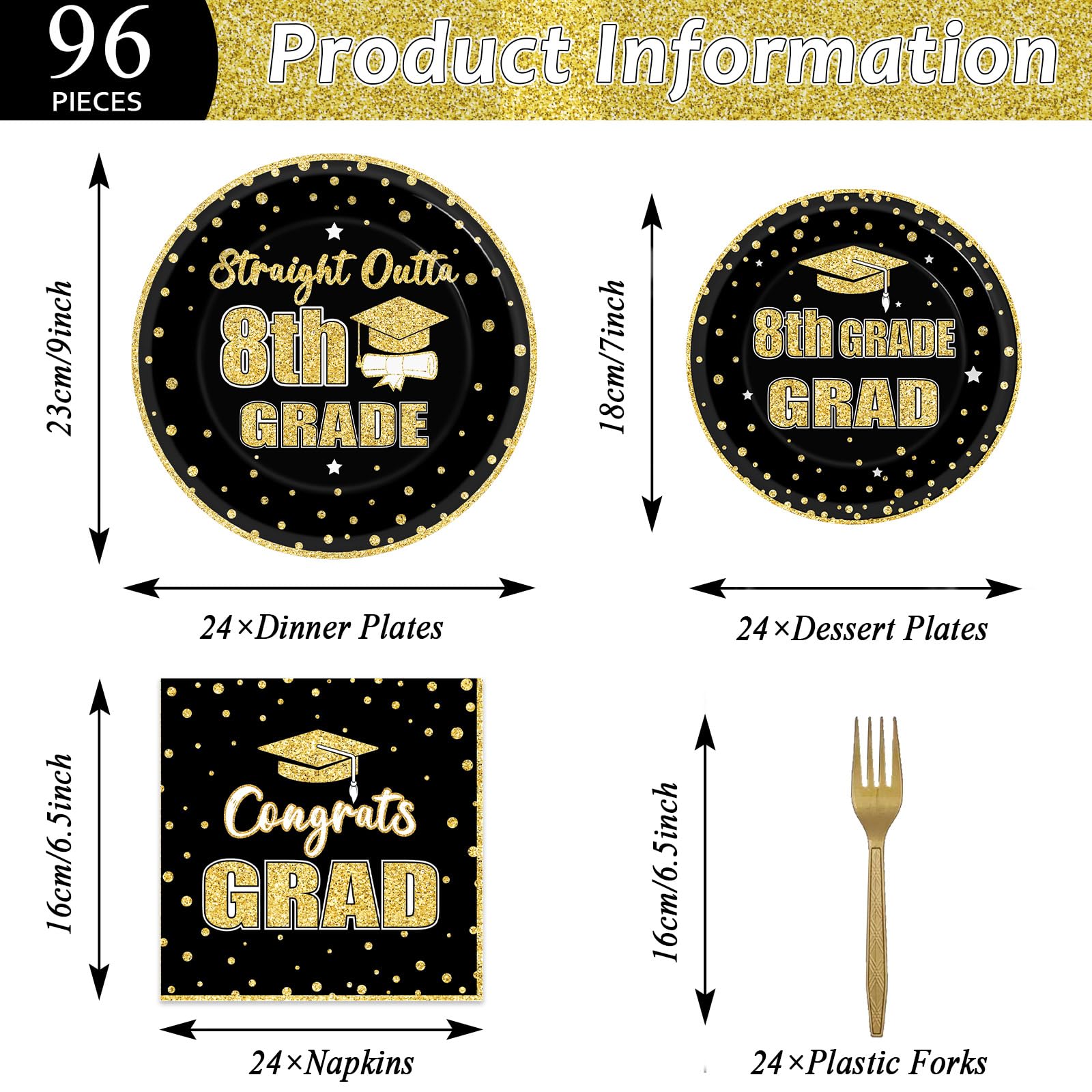 Serve 24 guests: our graduation dinnerware sets is totally 96 pcs, including 24 pcs 8th grade paper dinner plates of 9 inches, 24 pcs paper dinner plates of 7 inches, 24 pcs forks and 24 pcs napkins.