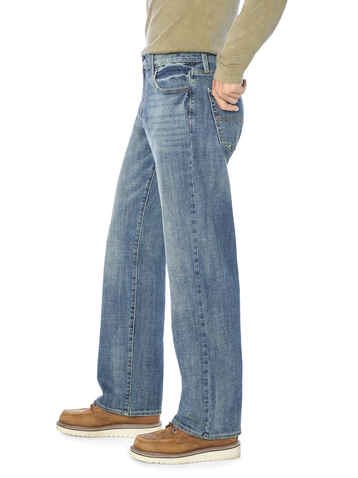 Relaxed-fit midrise jean with whiskering, fading, and five-pocket styling