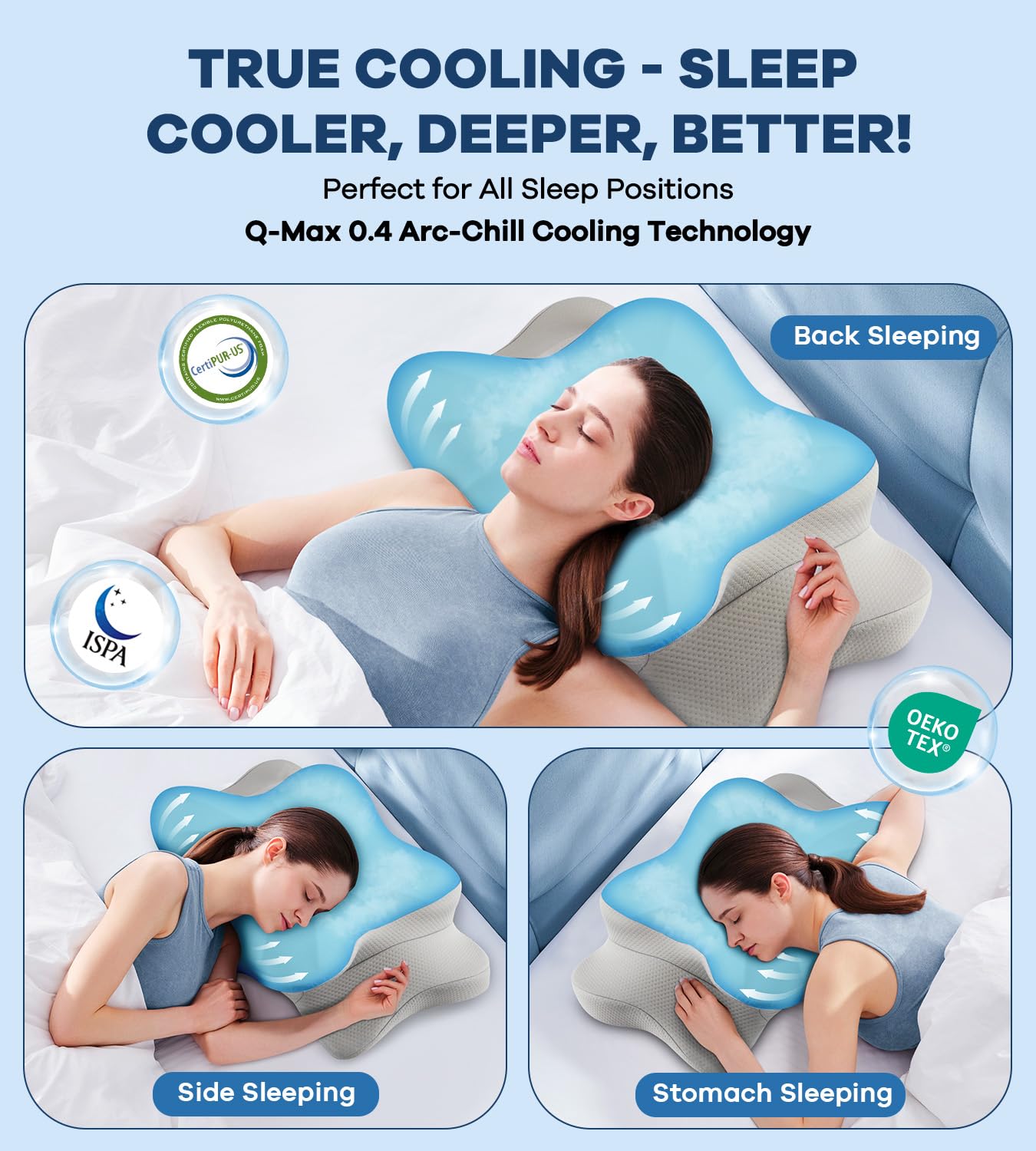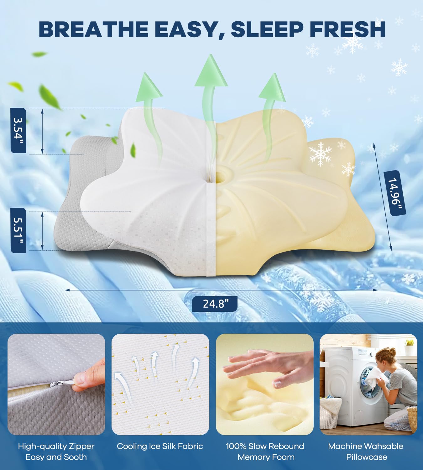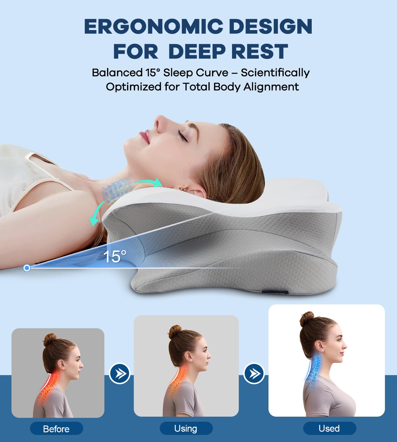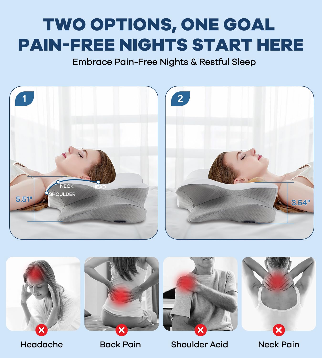 【QUALITY SLEEP STARTS WITH A GOOD PILLOW】Are you always waking up with neck cramps or back pain? Our proven ergonomically designed, contoured memory foam pillow supports your head, neck, shoulders and back perfectly. The innovative design allows our pillows to naturally fit your curved spine perfectly, providing proper support for spinal alignment,makes you to shift between positions comfortably.So you will wake up relaxed and start a more energetic day.