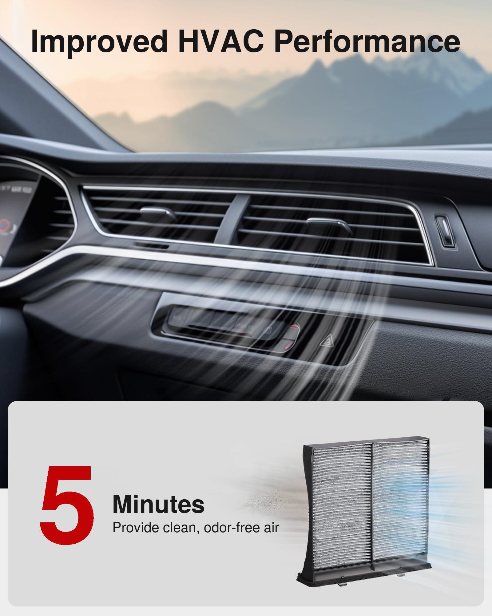 Enhances HVAC performance: It is recommended to replace your cabin air filter every year or every 12,000 miles. For optimal performance, those driving in heavily polluted areas or on dirt roads should change it every 5,000 miles. These filters help maintain the efficiency and longevity of the vehicle's heating, ventilation, and air conditioning (HVAC) system, maintaining optimal airflow and reducing strain on the system.