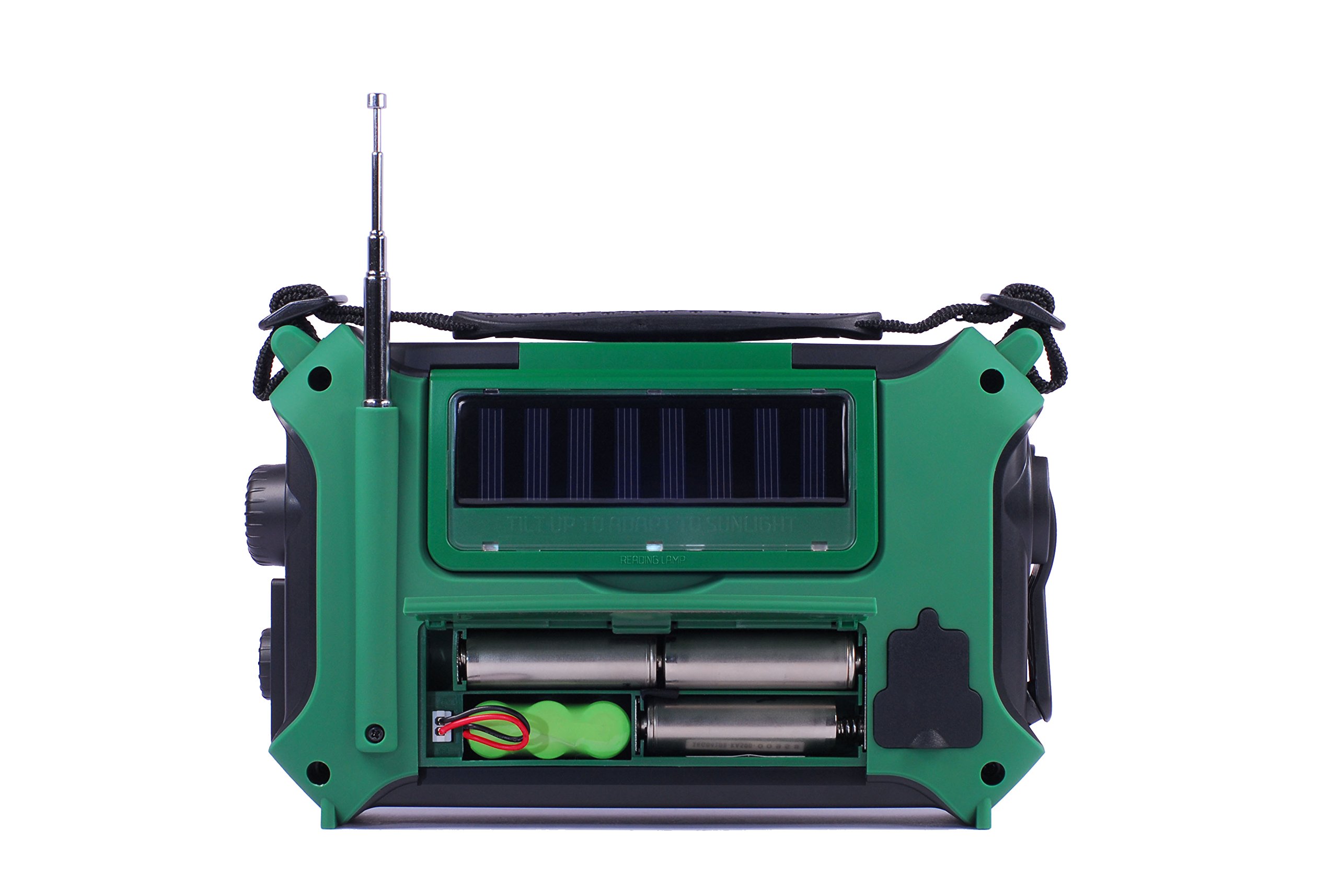 5-way powered emergency radio, AC, battery, hand crank, solar, computer