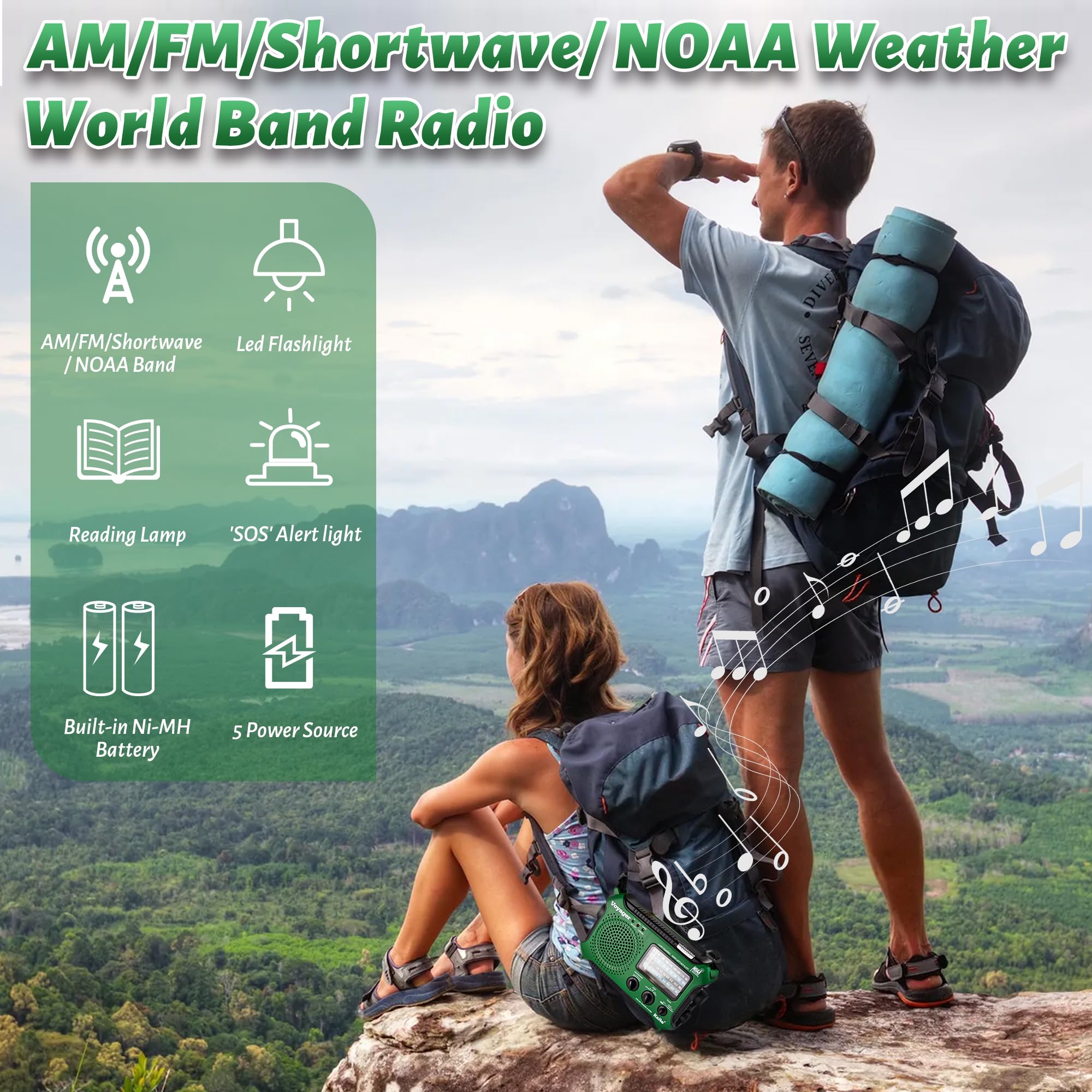 AM/FM/Shortwave radio and 7 pre-set NOAA weather channels with alert