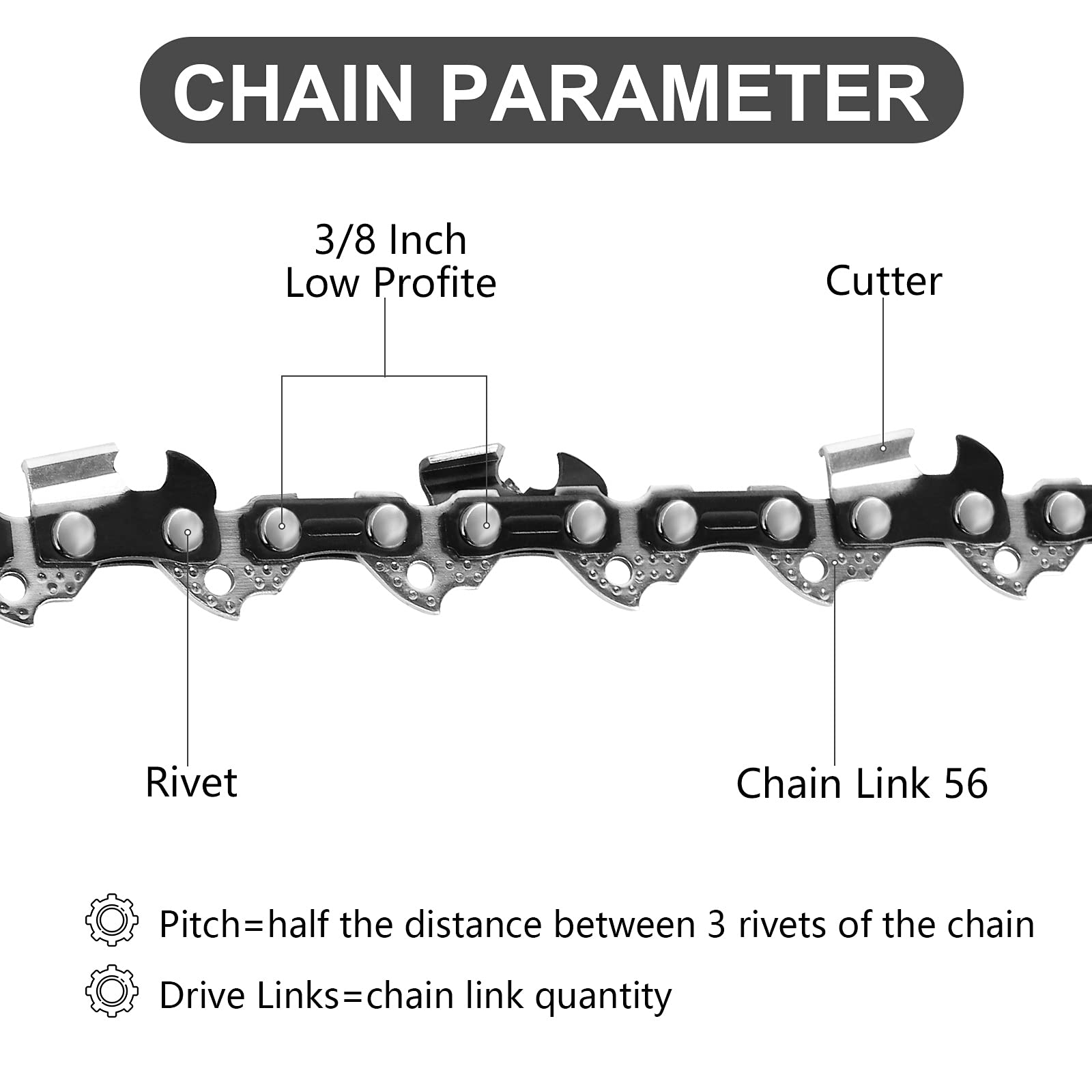 PARAMETERS: This chain saw chain include 2 saw chains, 16-Inch bars. Pitch:3/8" low profile, Gauge: 050", Drive link count: 56.