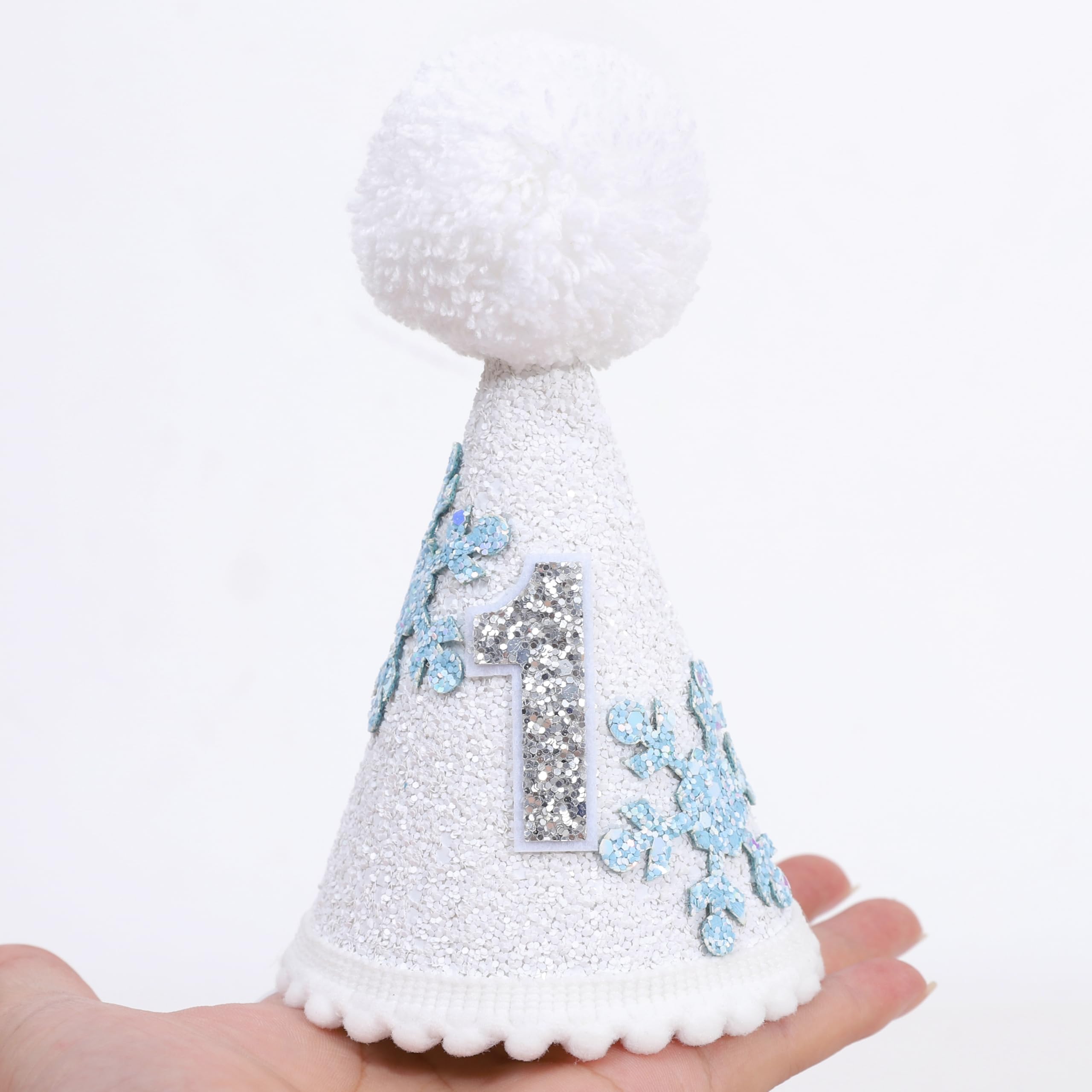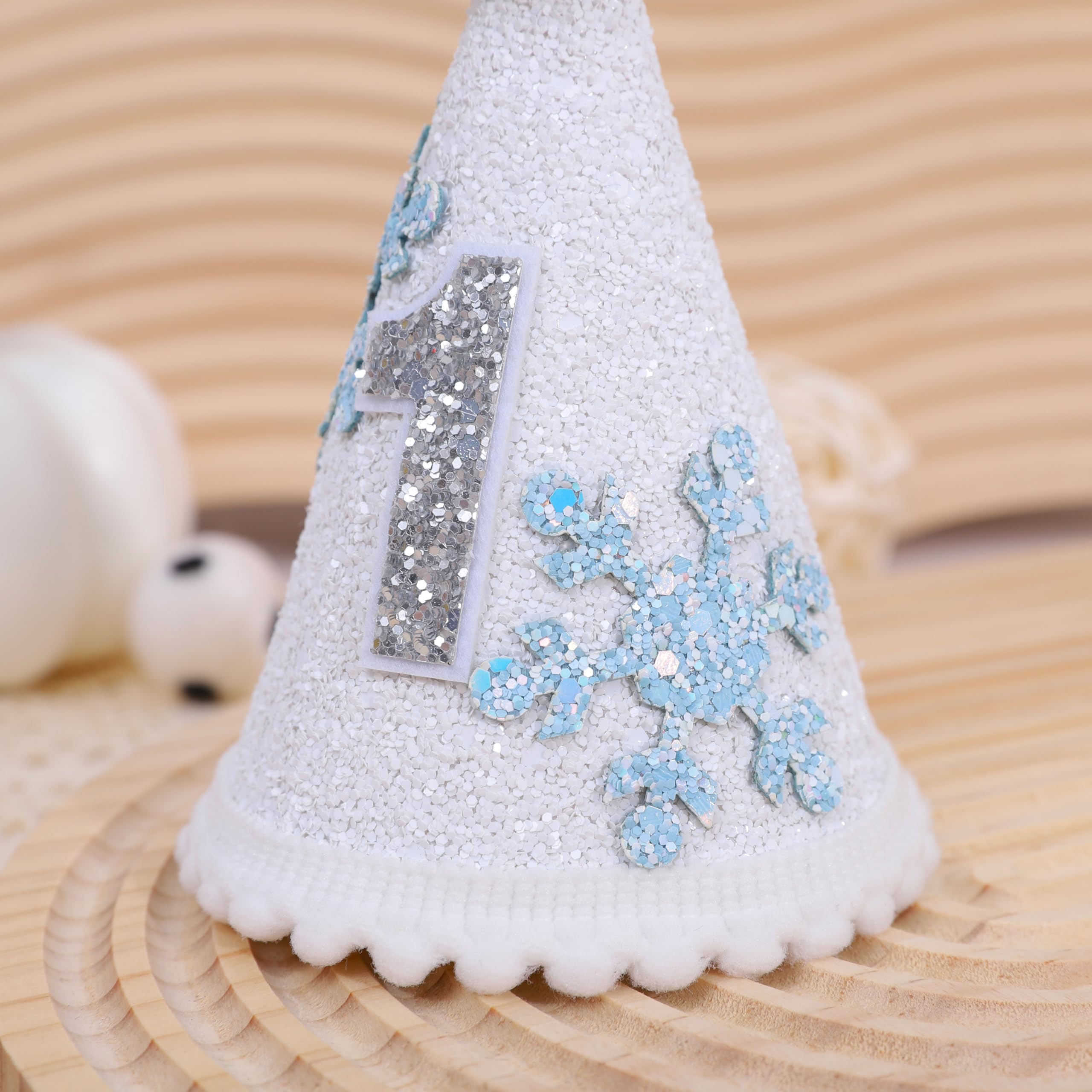 Elegant Snowflake Design: Featuring shimmering blue snowflakes and a glittery silver "1" on the front, this birthday hat captures the beauty of a wintery theme.