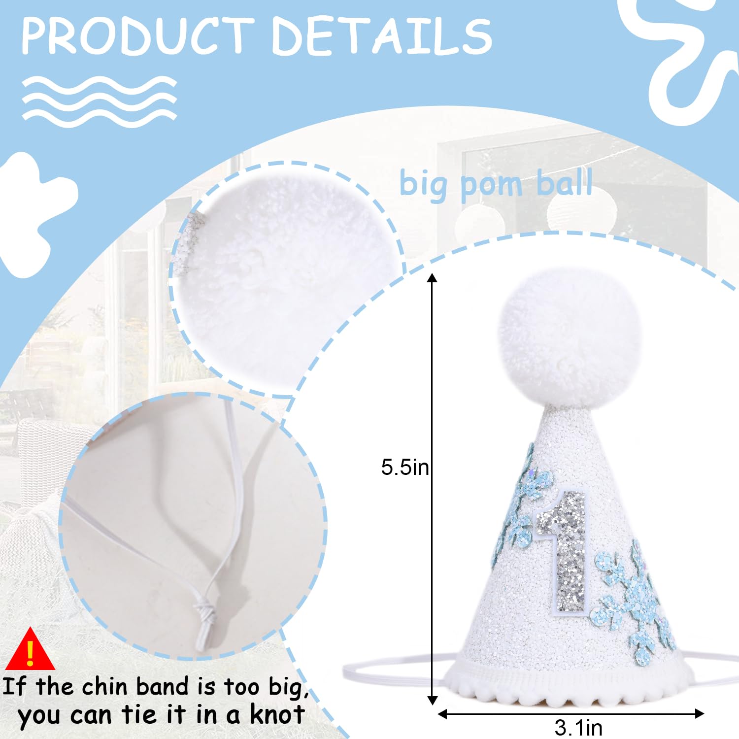 Comfortable Fit: With a stretchy elastic band, If the elastic band is too big, you can tie a knot to fit your baby's head to keep it stay securely in place throughout the party.