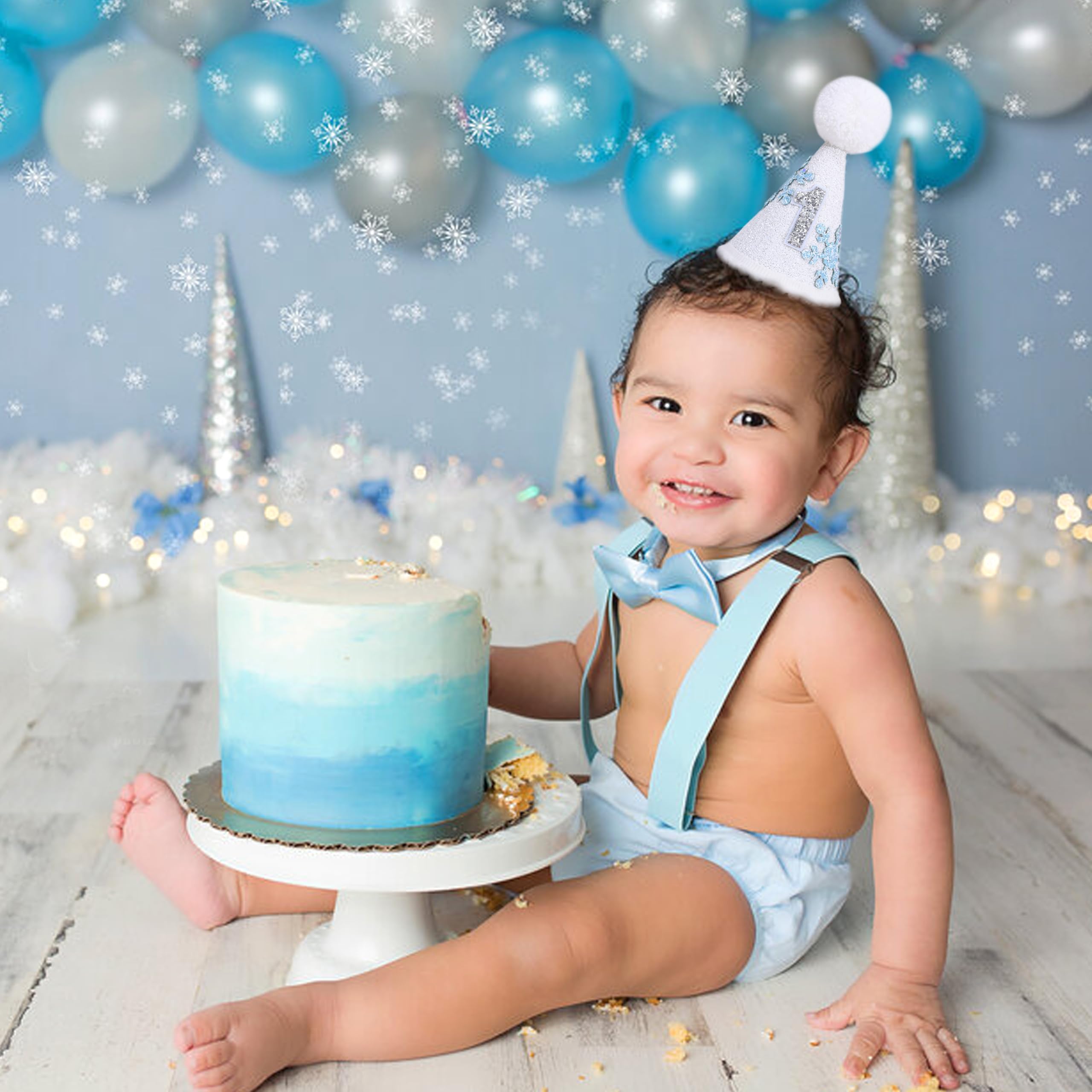 Add A Touch Of Winter Magic: This Winter wOnederland 1st Birthday Hat is the perfect accessory for both boys and girls, adding a frosty and fun vibe to their special day. The glittery snowflake design and the classic blue and silver theme create the ideal winter wonderland birthday decoration.