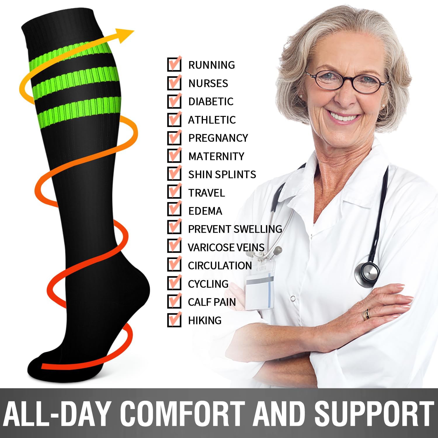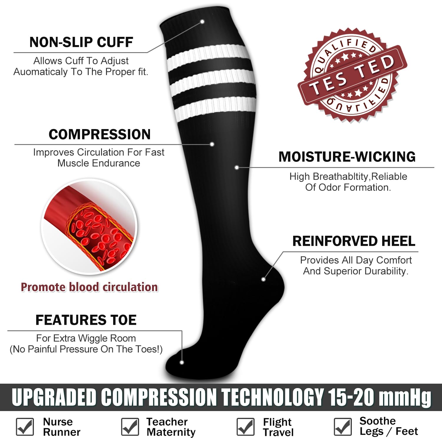 GIVE LIFE TO YOUR LEGS! - More improve circulation means more Healthier legs and less pain+swelling.Our Graduated Compression Socks put pressure in just the right spots.Provides true graduated compression to support your legs,reduce fatigue,soreness,and prevent injuries at the same time.Progressive compression technology has been recognized by many users Our copper compression socks is self-care staples.Make you feel great-no matter where,no matter when,and no matter what you're up to!