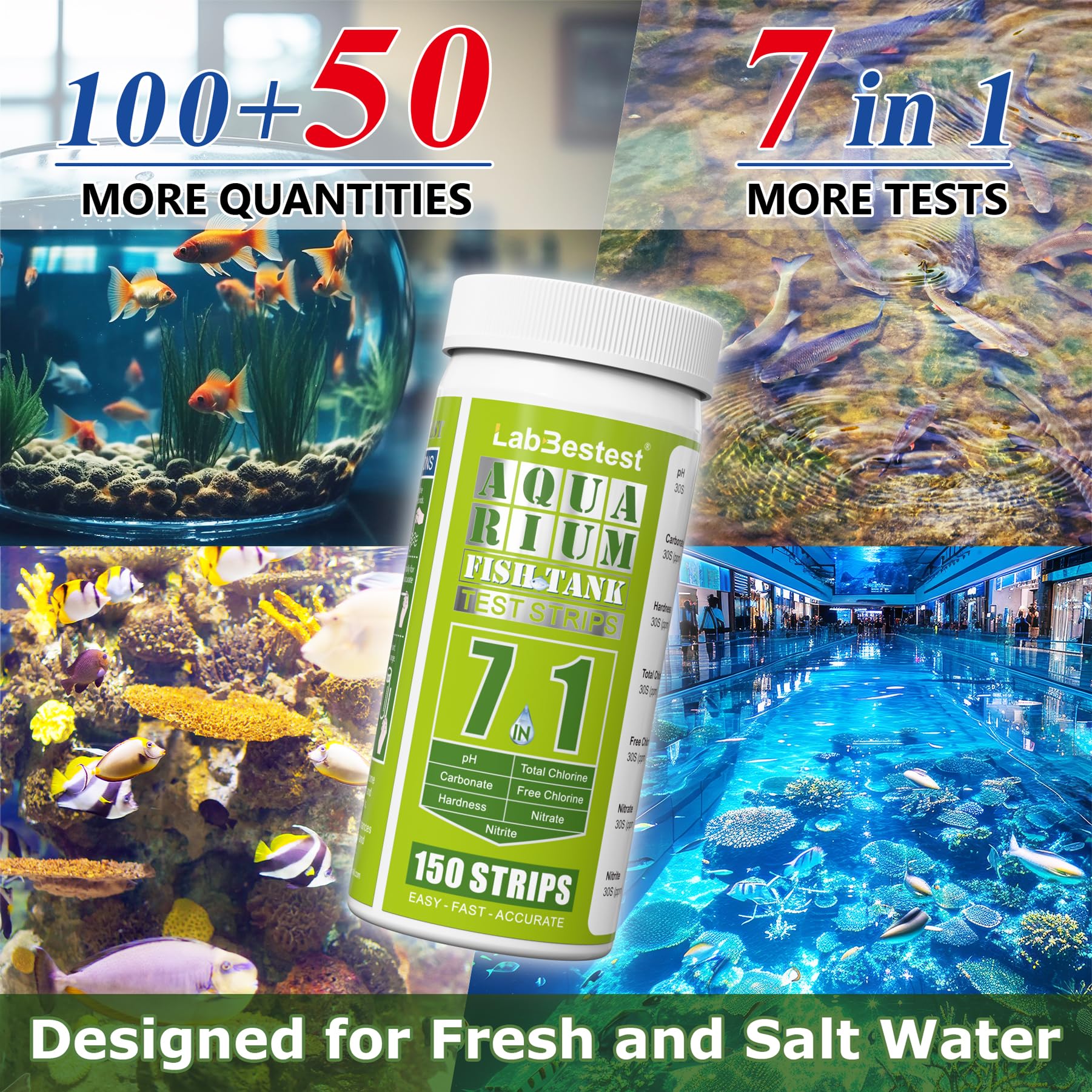 7-Way Professional Aquarium Test Strips Kit: LabBestest No Lab Visit. Get Lab-Accurate Result. LabBestest has many quality certificates such as CE, ISO. The kit measures 7 key parameters like pH, Carbonate, Hardness, Total Chlorine, Free Chlorine, Nitrate, Nitrite. (Note: It does not include Ammonia). Allowing you to have a complete understanding of your aquarium water quality